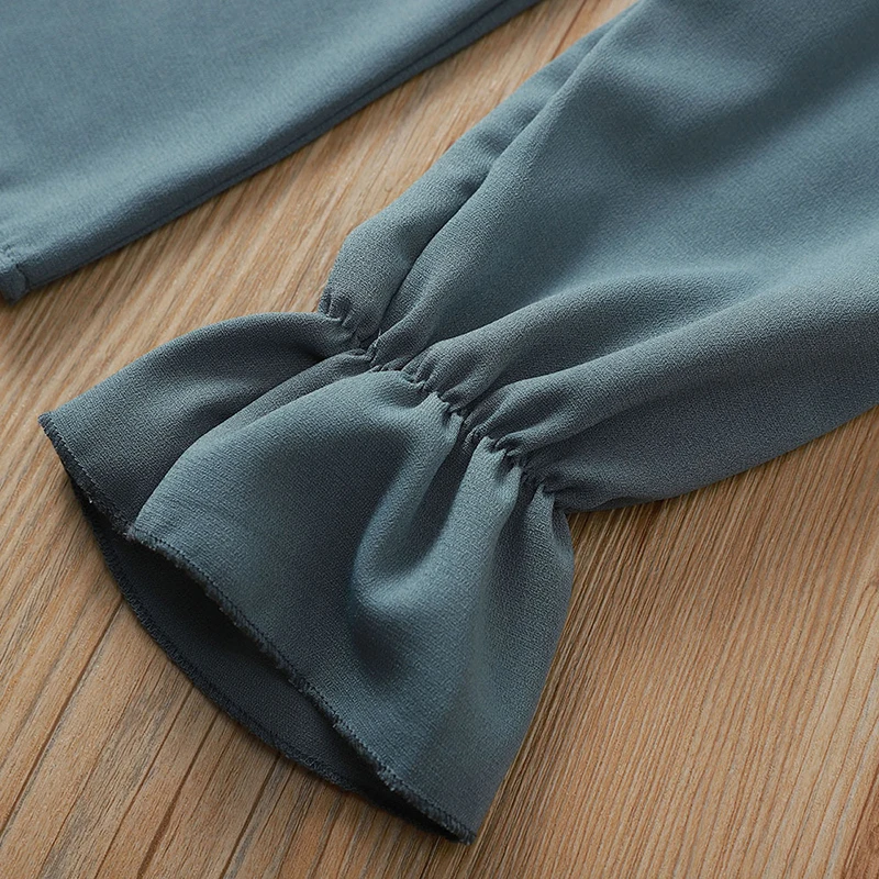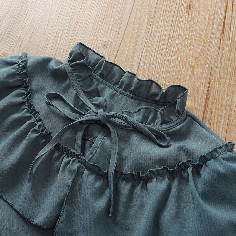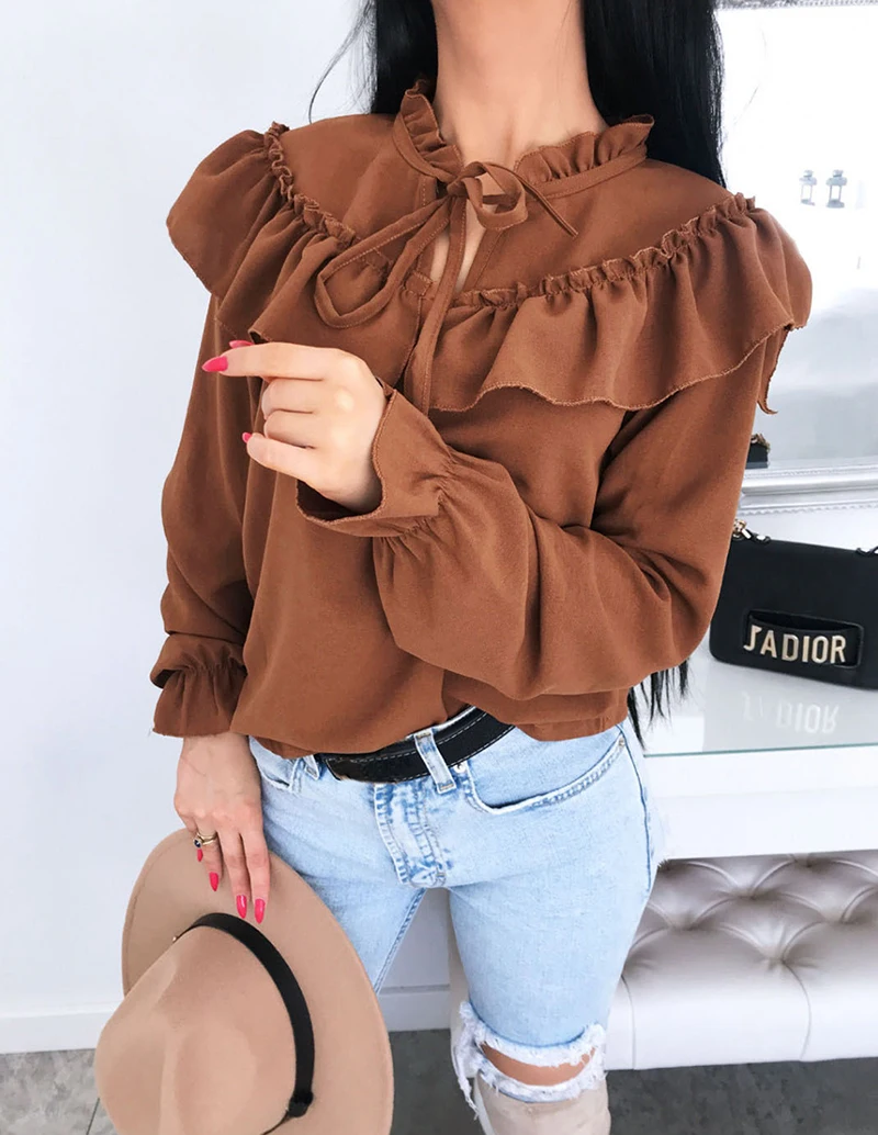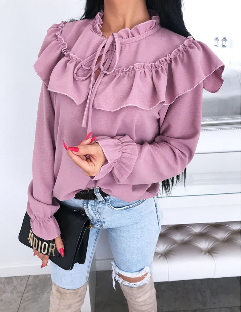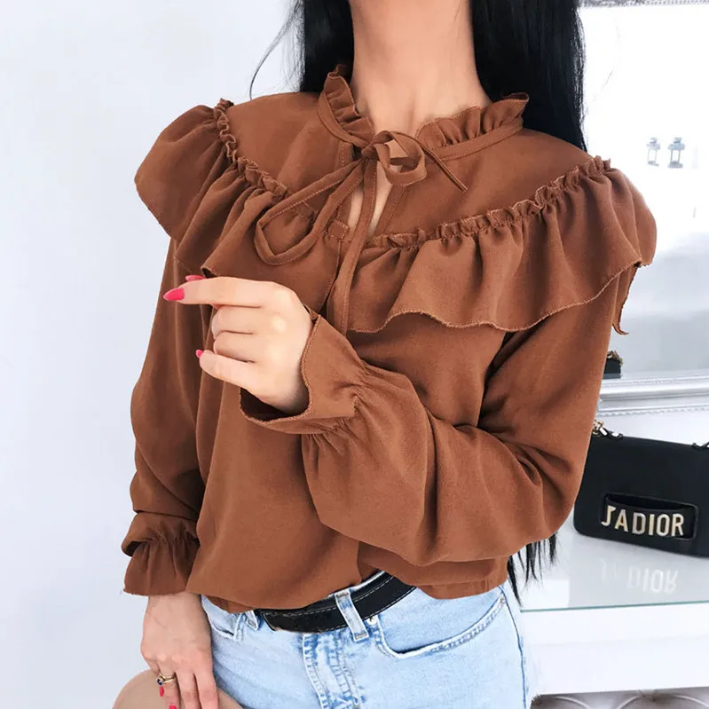 Женская блузка с оборками, длинным рукавом и вырезом лодочкой