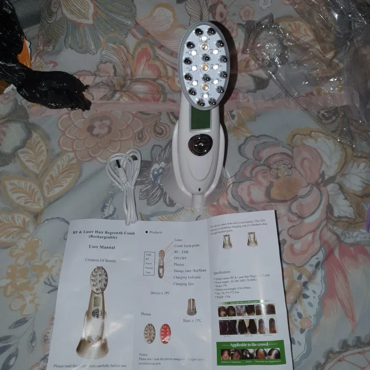 Тип изделия: расческа для роста волосЦвет: белый/золотистыйМатериал: ABSВход: 100-240 ВМощность: 3 ВтДлина волны фотона: 630-650нмВес: 140 гРазмер: 4*19 см/1,57*7, 48 дюймов