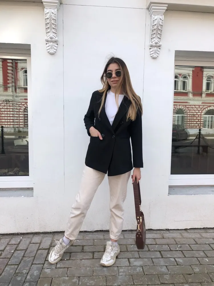 Пиджак из тонкой ткани, форму не особо держит. Взяла размер S на рост 163 и вес 50, пиджак сидит свободно, оверсайз, как я и хотела. Гладить на высоких температурах категорически не стоит, остаются полосы. Визуально пиджак нравится, очень универсальная вещь - и с джинсами, и с юбкой будет смотреться замечательно! Пришел недели за 2, никогда у меня вещи с али так быстро не приходили. Рекомендую, несмотря на маленькие недочеты