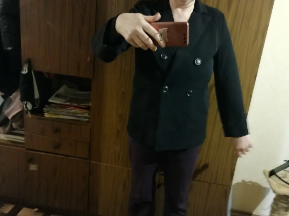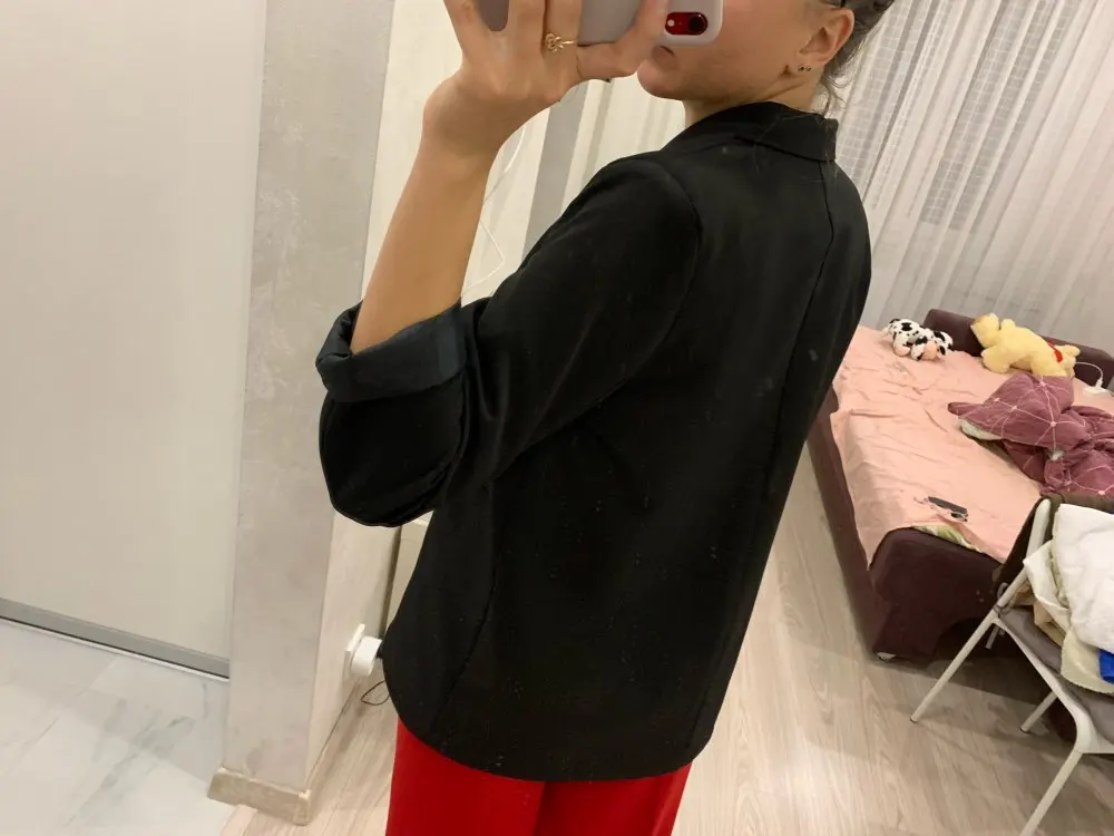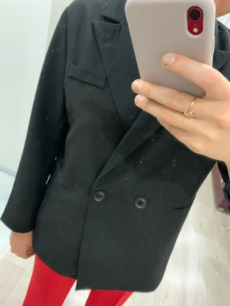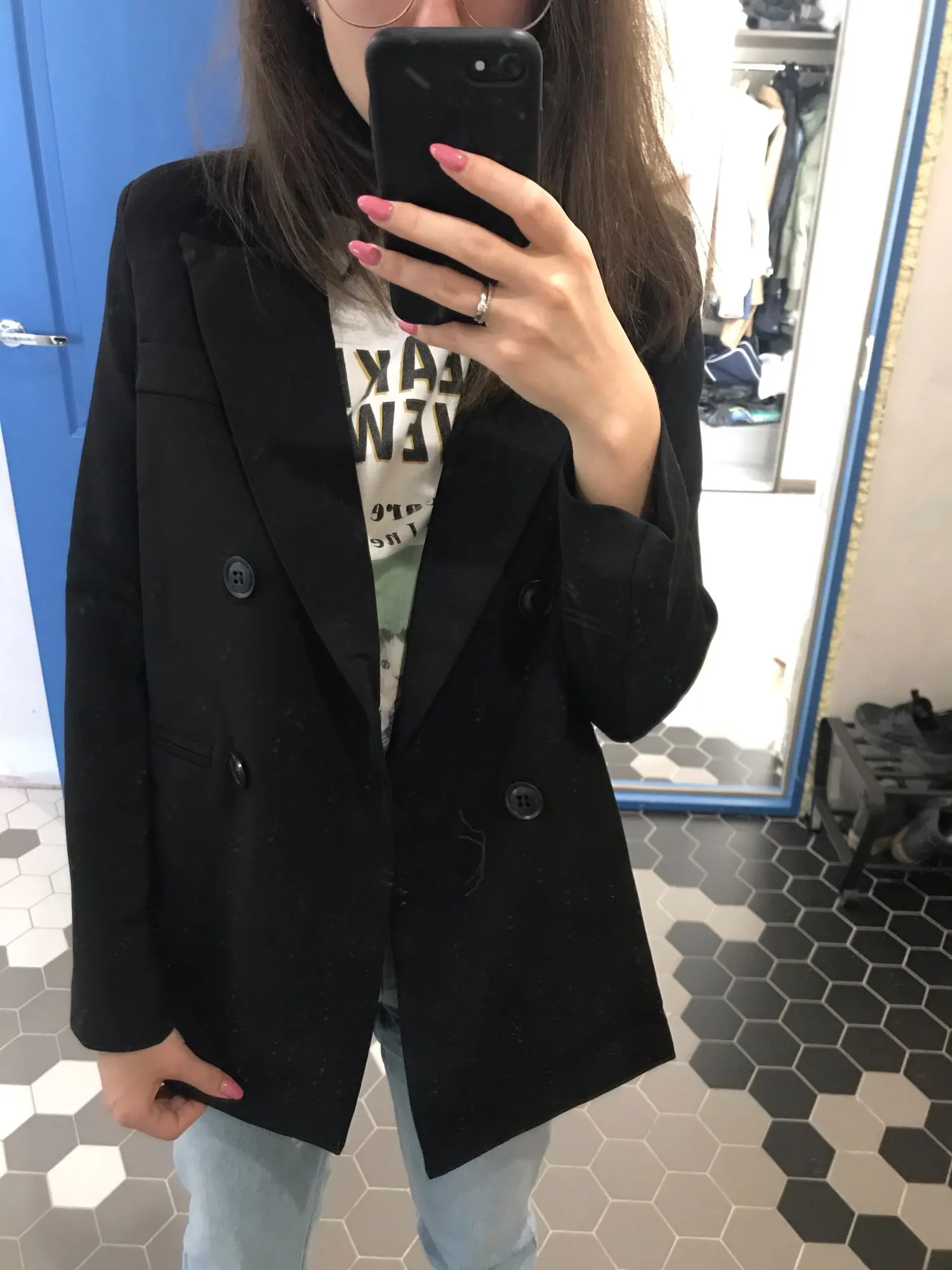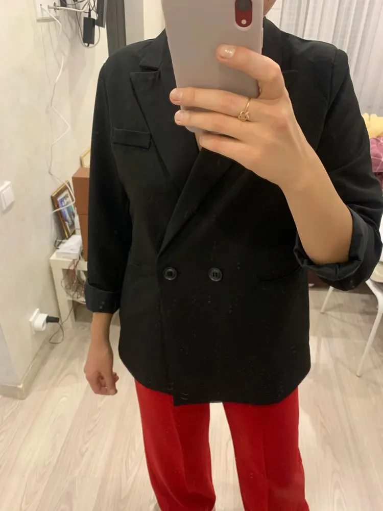 Пиджак хороший. Брала по размерной сетке на 2 размера больше своего, чтобы был оверсайз. Надо было брать на 3 размера больше)). Он тонкий, но форму держит. Хороший чёрный цвет, не блестит дешевизной. Дошёл быстро