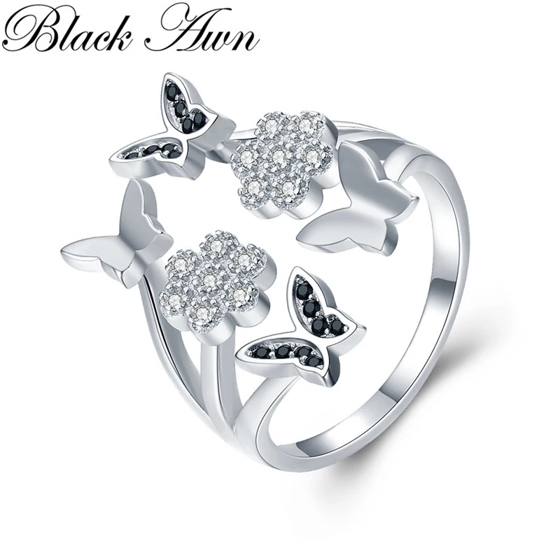 BLACK AWN серебряные ювелирные изделия с бабочкой и цветком элегантные обручальные Открытые Кольца для женщин G028