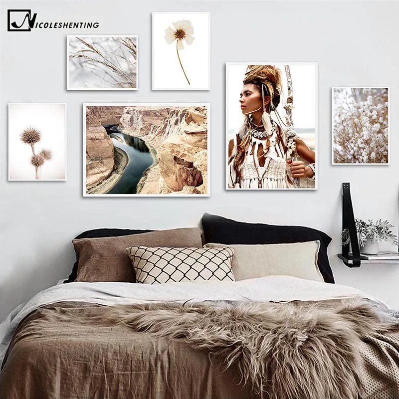 Дикий Бохо женщина трава тростники плакат скандинавский холст стены...
