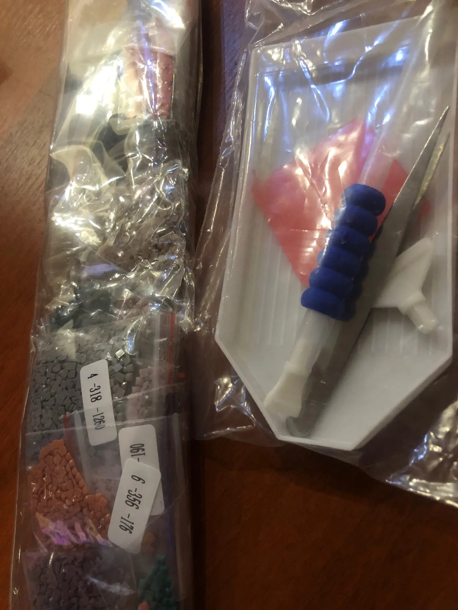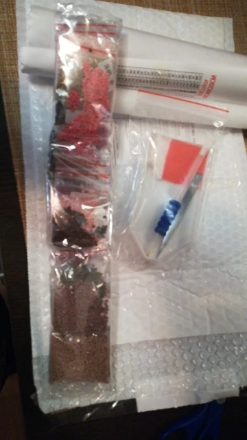 Отлично запаковано, основа свёрнута в рулон, не замята. Стразики, назовем их так, в зип-пакетах, всё, что необходимо для работы имеется. Долетело за 12 дней, просто восторг! Покупала на новогодний подарок маме. Ни разу не занимались такой вышивкой. Будем разбираться