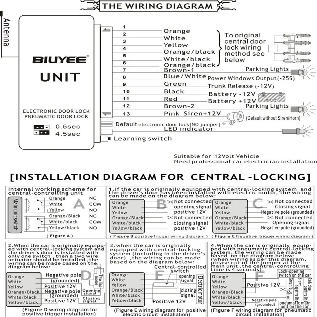 Особенности: 1. Блокировка: Нажмите кнопку "LOCK" пульта дистанционного управления один раз, парковочный светильник Вспышка один раз, звук сирены один раз, центральный замок двери автоматически. Светодиодный индикатор мигает один раз в секунду. (По умолчанию нет сирены нет звука) 2. Разблокировка: Нажмите кнопку "разблокировка" пульта дистанционного управления, парковочный светильник Мигание дважды, сирена звук дважды, центральная дверь разблокировка automati- Cally, светодиодный индикатор будет закрыт. 3. Поиск автомобиля: Нажмите кнопку "Колокольчик" пульта дистанционного управления один раз, парковочный светильник Будет мигать 30 s, сирена будет звучать, нажмите ту же кнопку снова Остановится; если нет этой кнопки, нажмите кнопку блокировки много раз. 4. Электронный дверной замок/пневматический дверной замок: Основной блок по умолчанию электронный замок. 5. Обучение: обучение: Нажмите кнопку обучения один раз, Поворотный Светильник, вспышка один раз, после нажатия кнопки дистанционного управления, Был изучен, если нужно узнать больше дистанционного, Повторите это Снова. 6. CLEAR: нажмите переключатель обучения 3 секунды поворота Светильник flash 3 раз был очищен. 7. Выход стеклоподъемника (-25 С) Нажмите кнопку "lock" один раз, поворотный свет мигает один раз и дверь Блокировка, теперь выходной сигнал окна питания отрицательный Триггер 25 s, функция зависит от задержки автомобильной цепи. 8. Релиз багажника (-3 s, 50mA) Нажмите кнопку "unlock/trunk/mute" на пульте дистанционного передатчика 3 секунды, чтобы отпустить багажник во время парковочных огней Будет мигать три раза. С помощью привода и реле. Параметры: Основного блока: Рабочее напряжение: постоянный ток 12 ± 3 в Статический ток: 8,5 мА Поворотный Светильник: 7,5 A x 2 Центральный замок: 10А/433,92 Рабочая частота: 433,92 МГц Пульт дистанционного управления: Рабочее напряжение: 12 В постоянного тока Средний Статический ток: 0 мА Размер коробки управления: 8,6x6,6x2,6 см (Д x Ш x В) Размер пульта дистанционного управления: 9,8x3,8x1 см (Д x Ш x В) Вес: 0,22 КГ Размер упаковки: 125*92*75 мм, 50 шт/Кантон, кантон Размер: MEAS: 41*34*40 см Об установке: Продукт должен быть установлен профессионалами с электриком автомобиля Сертифицированный Для автомобиля 12 В постоянного тока, который имеет центральный дверной замок Изделие без привода центрального дверного замка Посылка включает в себя: 1x Основной Управление блок 2x дистанционного Управление 1x жгут проводов 1x светодиодный индикатор 1x Руководство пользователя на английском и китайском языках