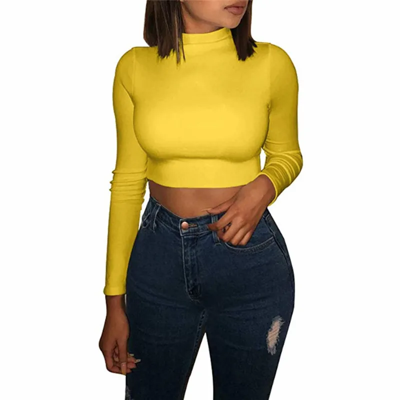 Однотонная женская Сексуальная футболка с высоким воротником, облегающий пуловер, короткая одежда, женская новая модная короткая футболка с длинным рукавом, Клубная уличная одежда