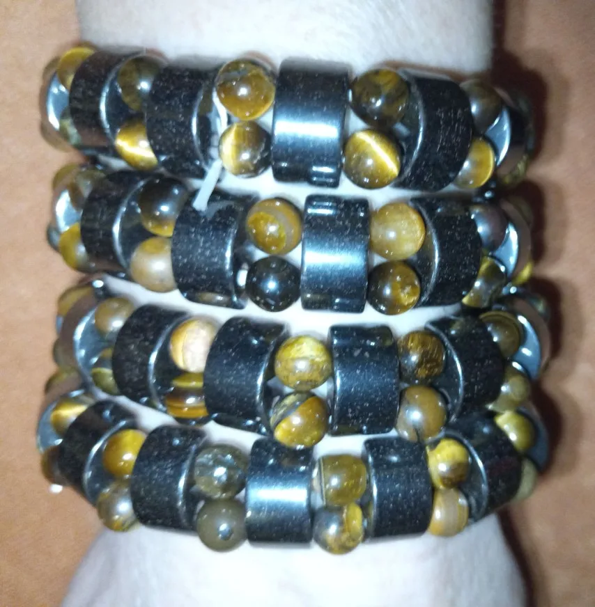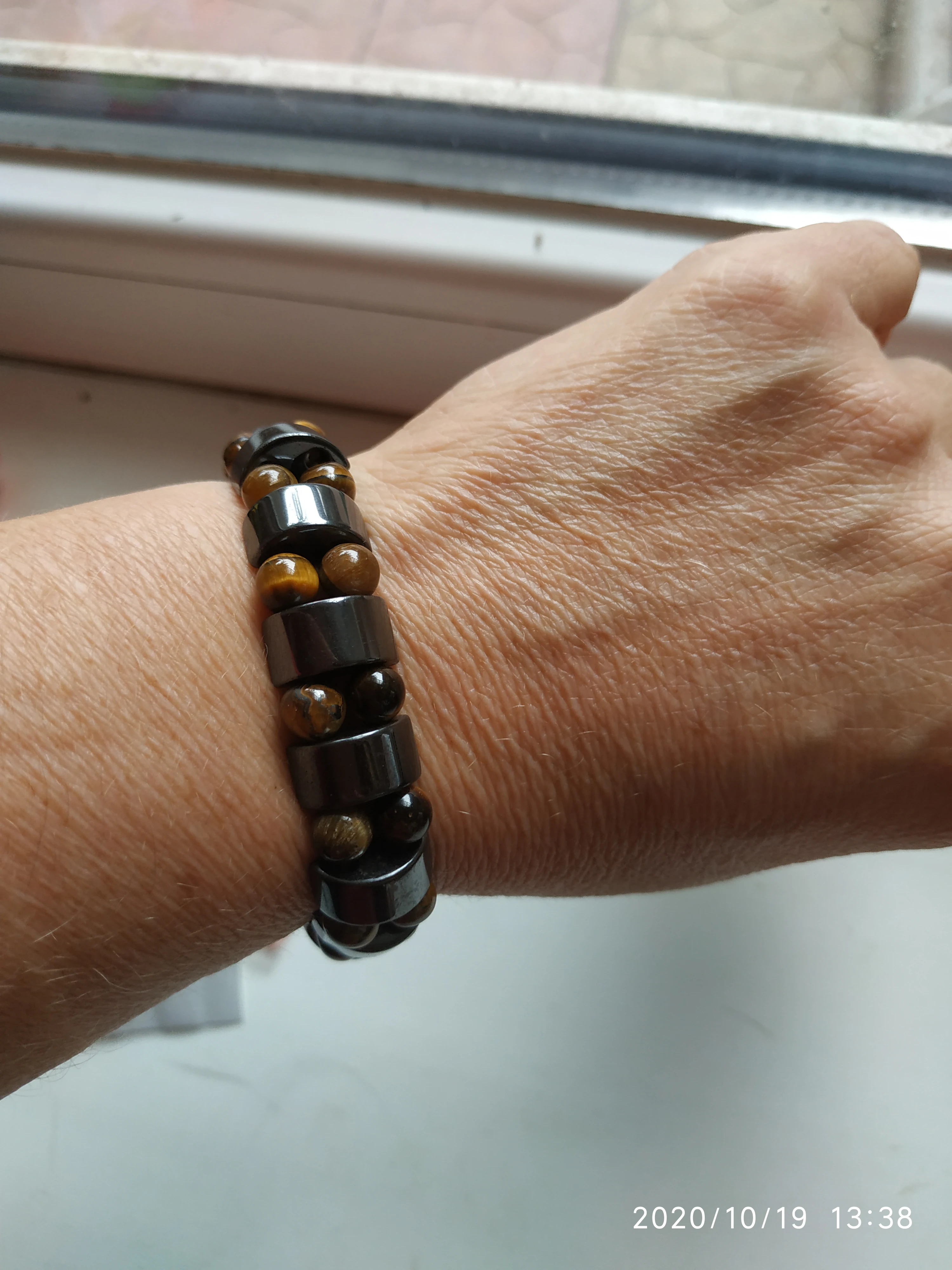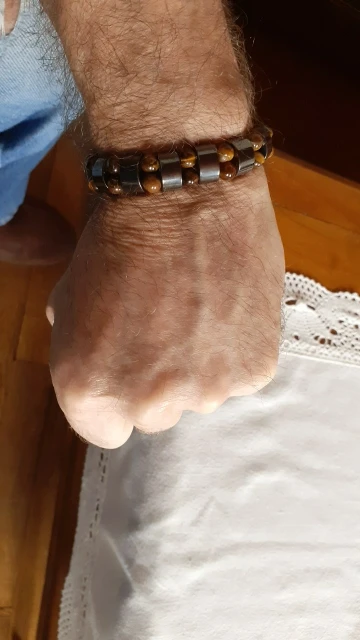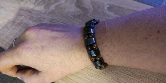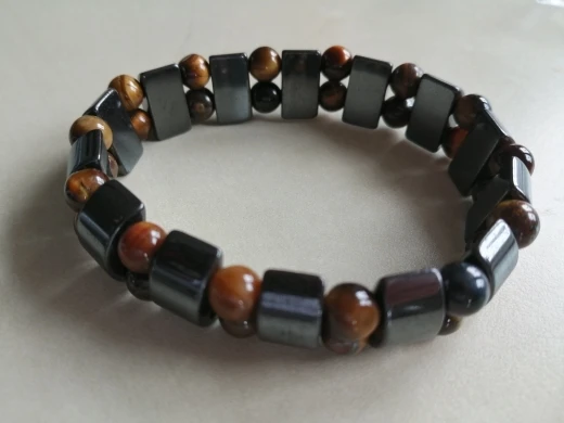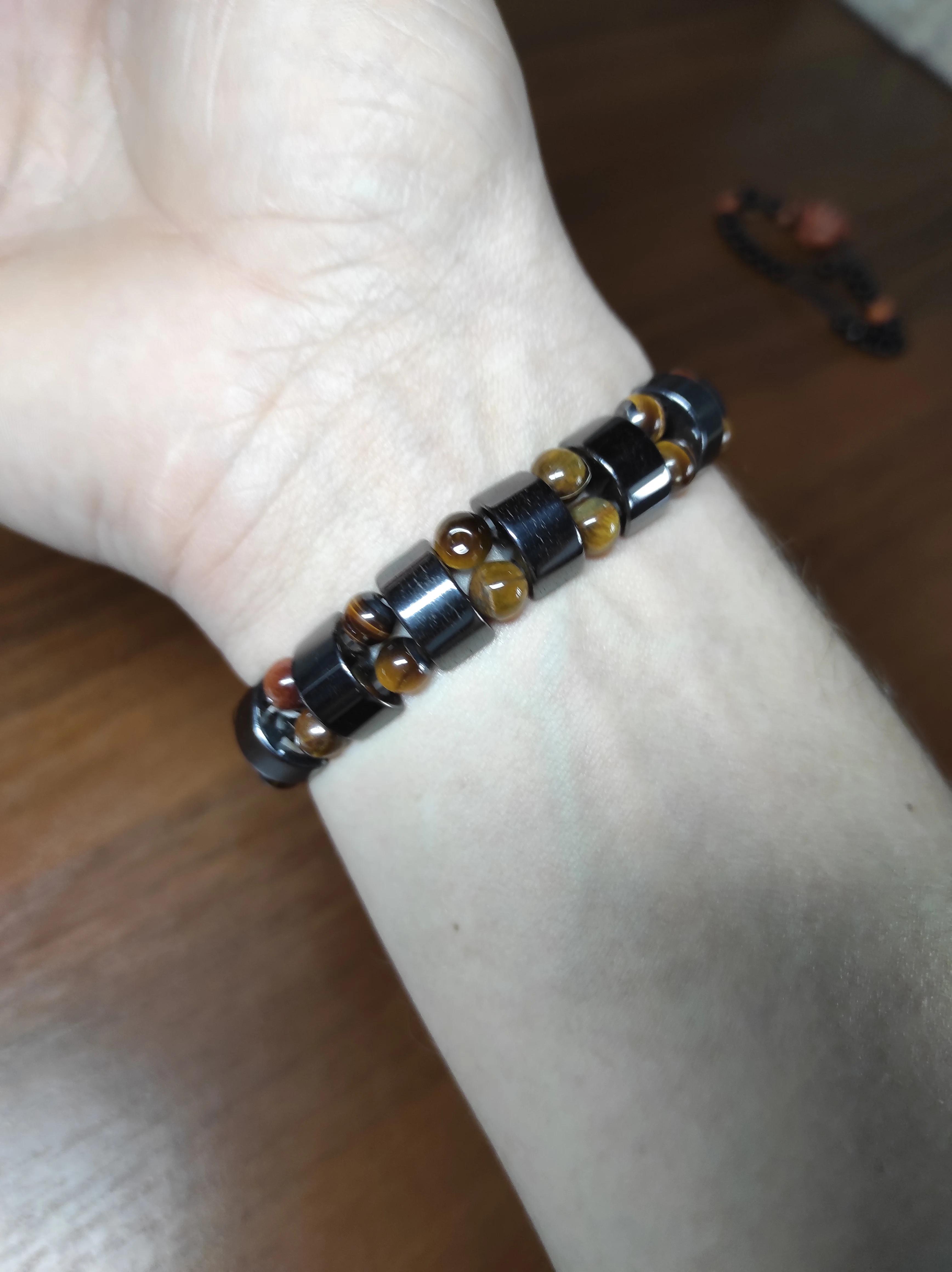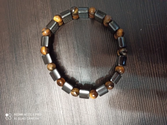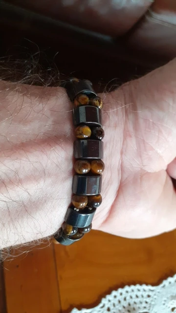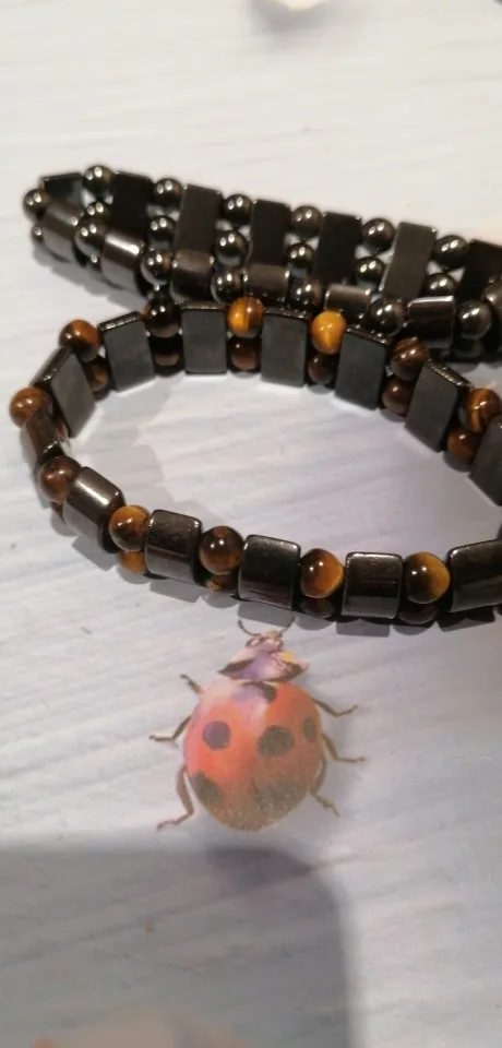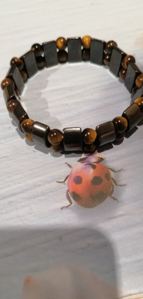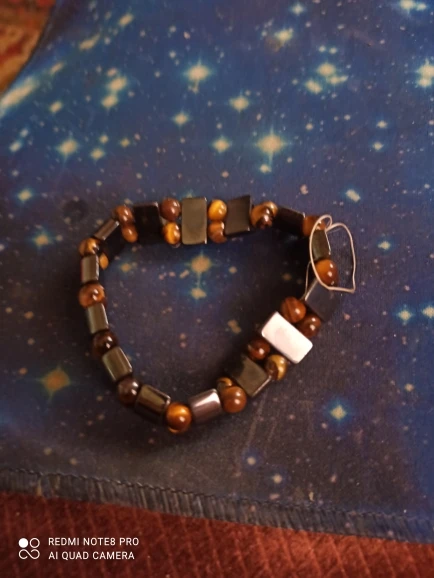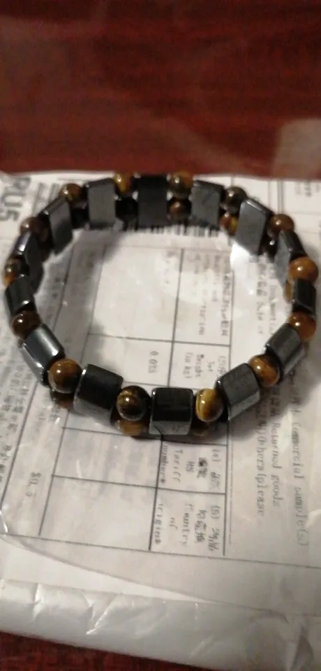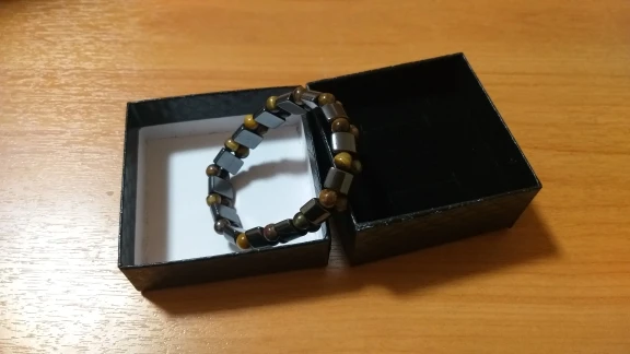 Браслет получила через месяц, внутри в пакетике на липучке. Брала гематит с тигровым глазом. Собран на резинку, тянется хорошо. На мою руку немного большой оказался (у меня окружность 16 см), думаю, что больше подойдёт мужчине (выглядит немного грубовато, темный). На магнетизм пока не проверяла - нет магнита, проверю позже (в вопросах пишут, что магнитит). Думаю, что подойдёт для ежедневного ношения (придется чуть уменьшить). Мне хотелось повседневный браслет из гематита и тигрового глаза.
