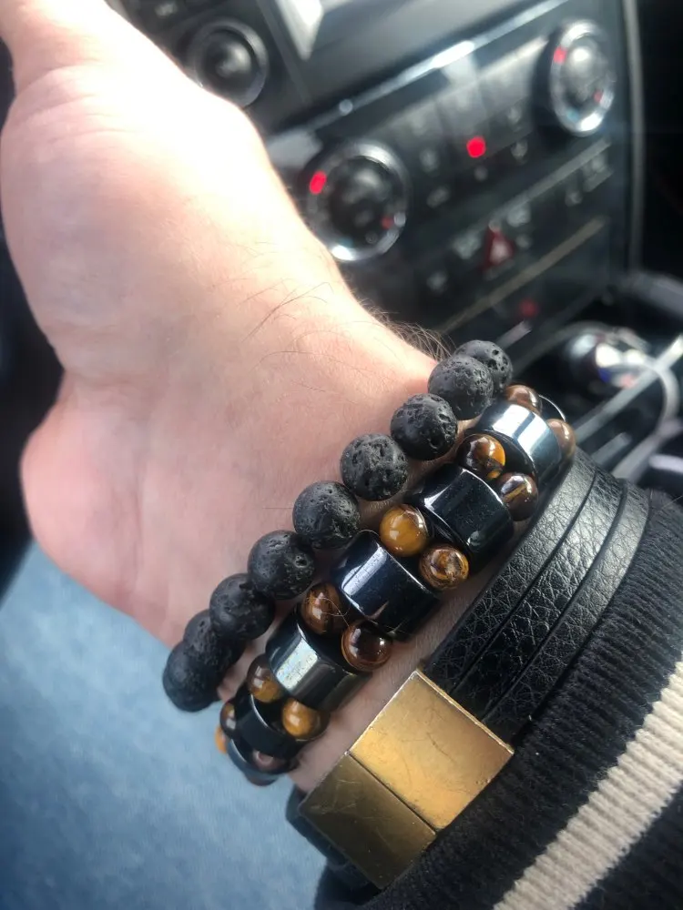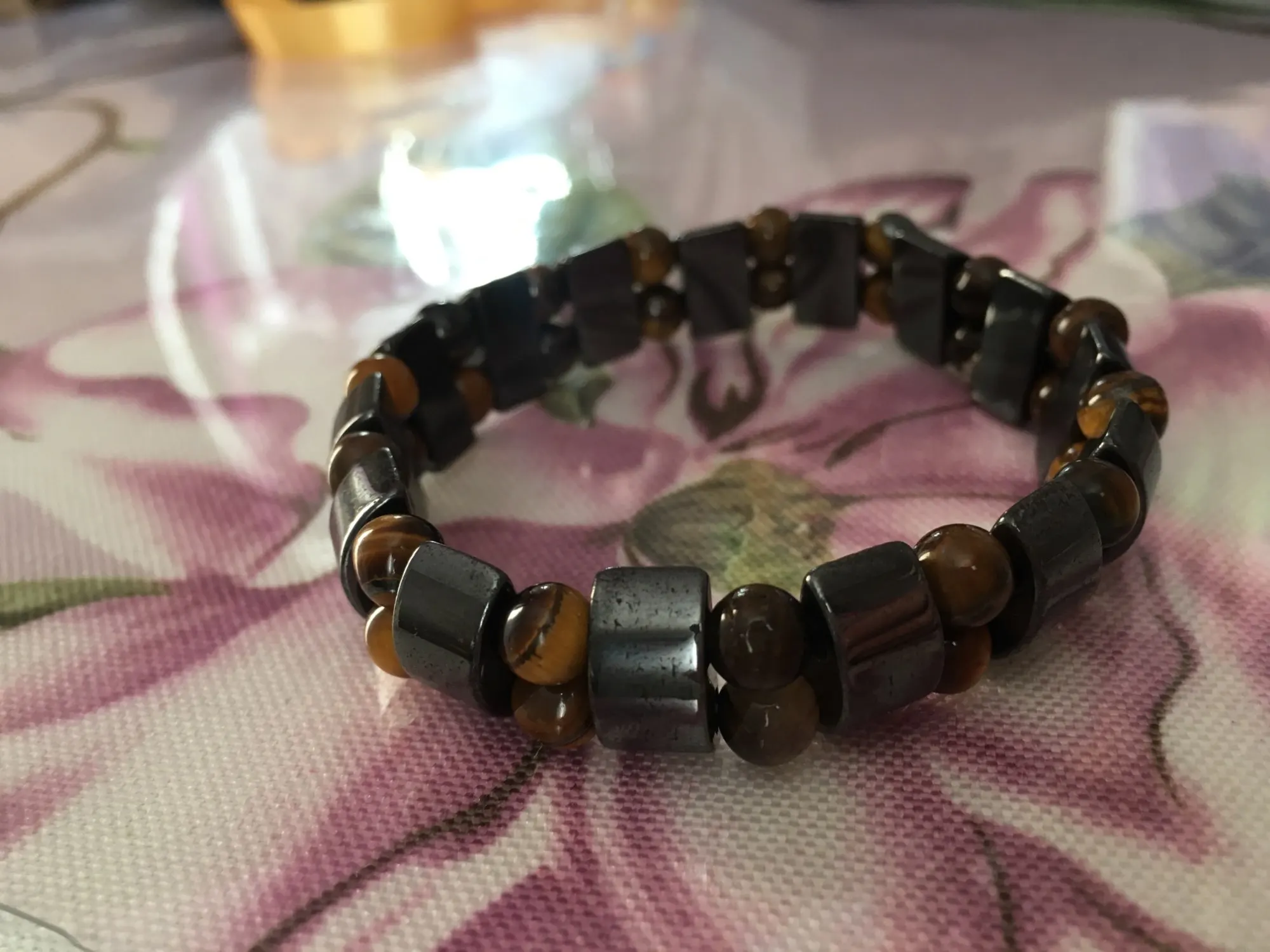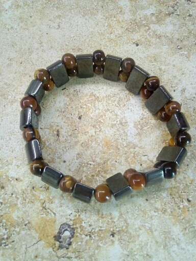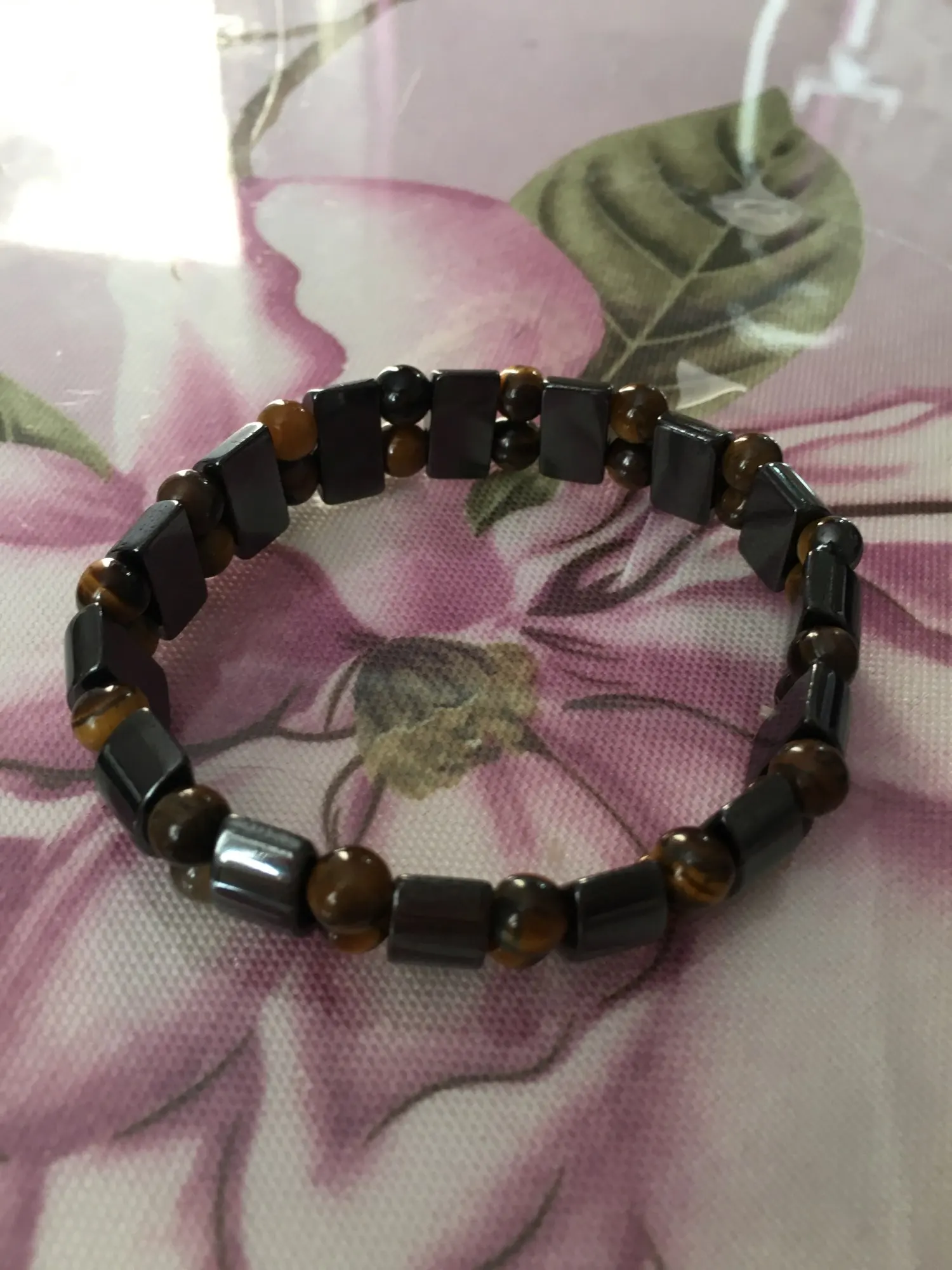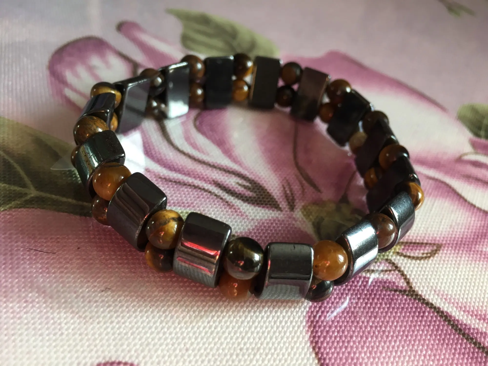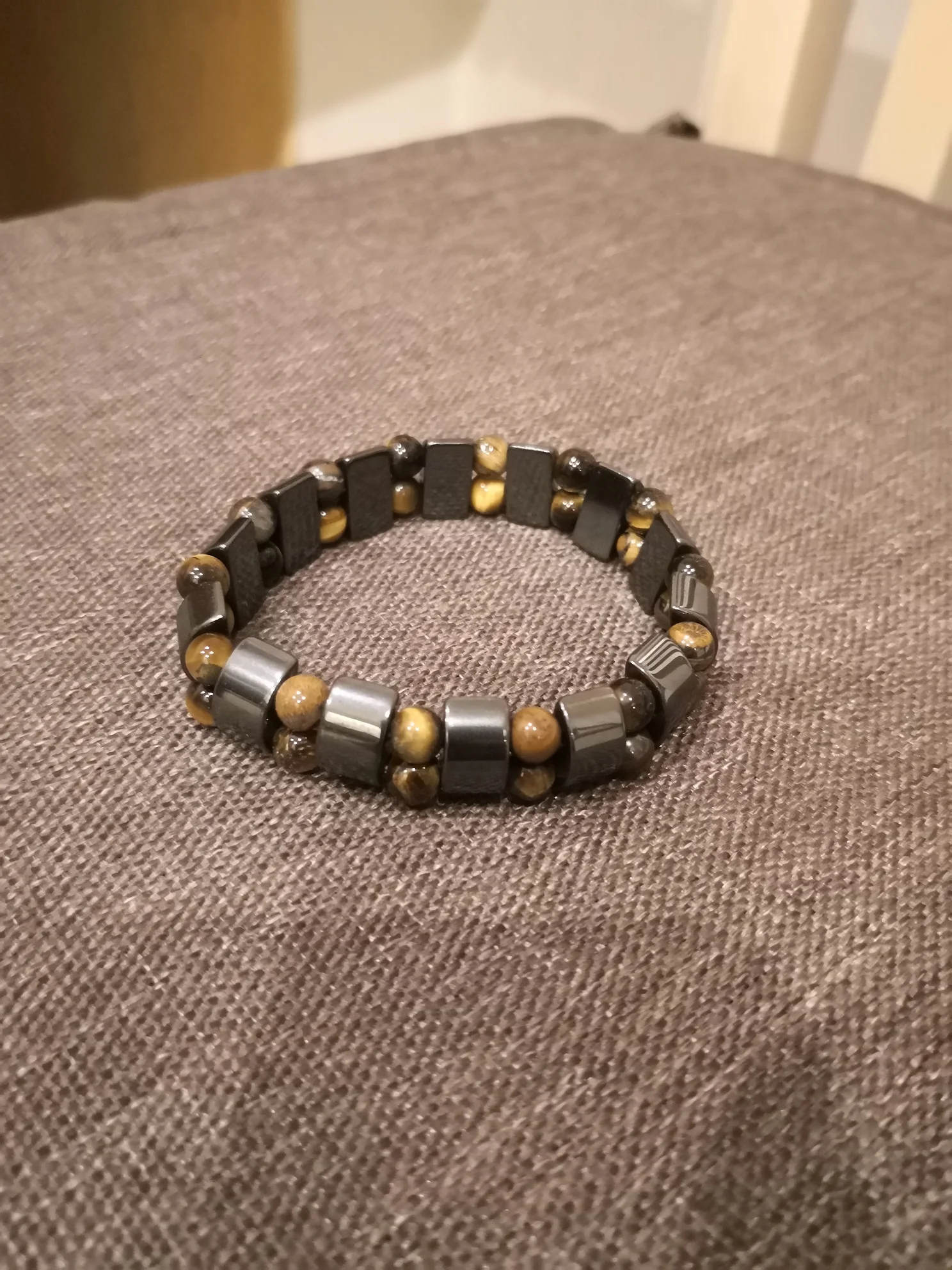 Браслет получила через месяц, внутри в пакетике на липучке. Брала гематит с тигровым глазом. Собран на резинку, тянется хорошо. На мою руку немного большой оказался (у меня окружность 16 см), думаю, что больше подойдёт мужчине (выглядит немного грубовато, темный). На магнетизм пока не проверяла - нет магнита, проверю позже (в вопросах пишут, что магнитит). Думаю, что подойдёт для ежедневного ношения (придется чуть уменьшить). Мне хотелось повседневный браслет из гематита и тигрового глаза.
