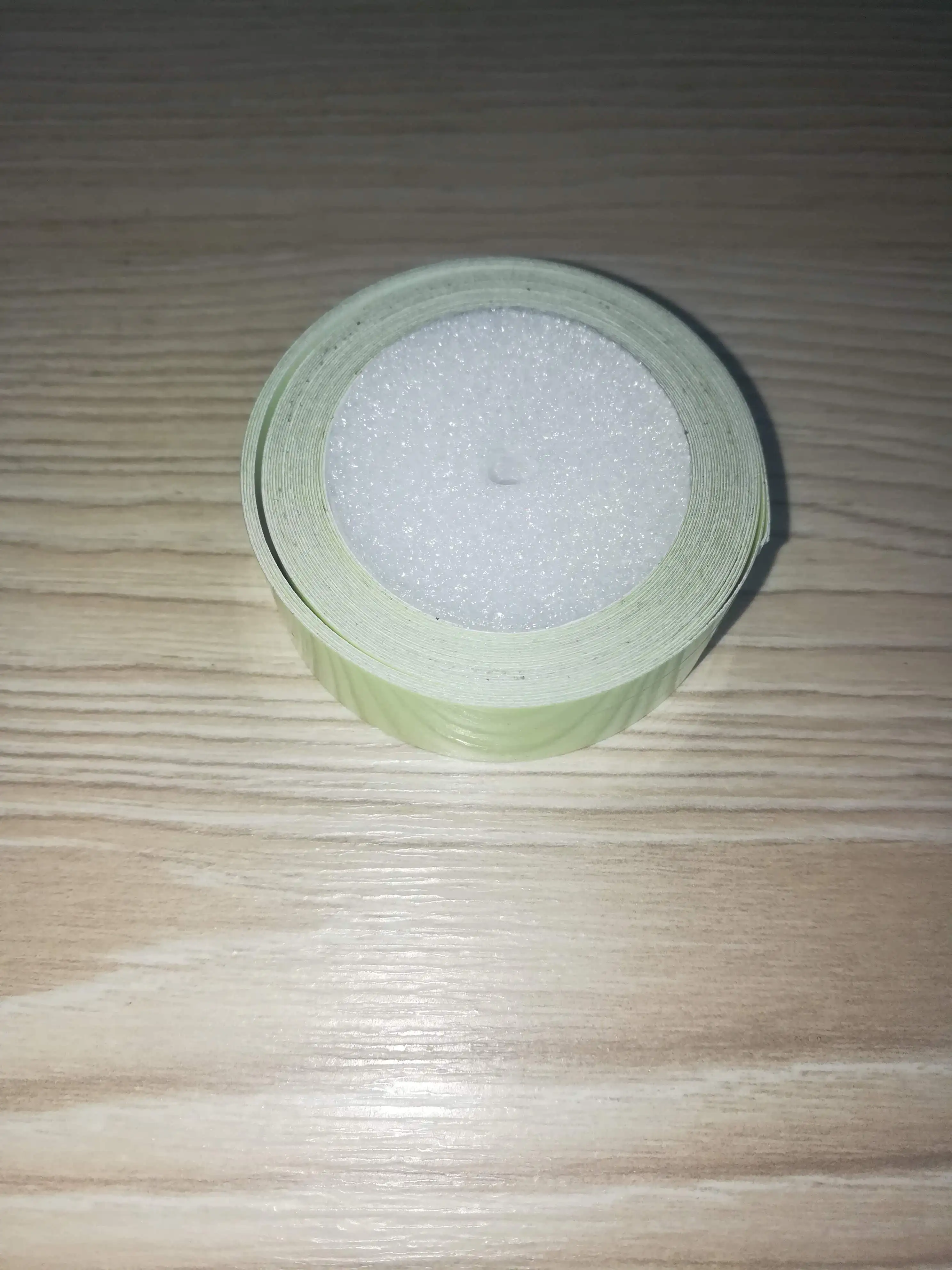 Как будто на изолента с одной стороны нанесли светящуюся краску. Свет держит достаточно долго. К утру в полной темноте можно различить.