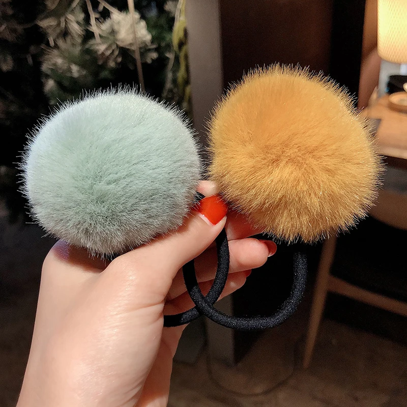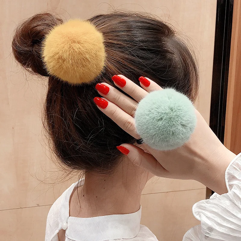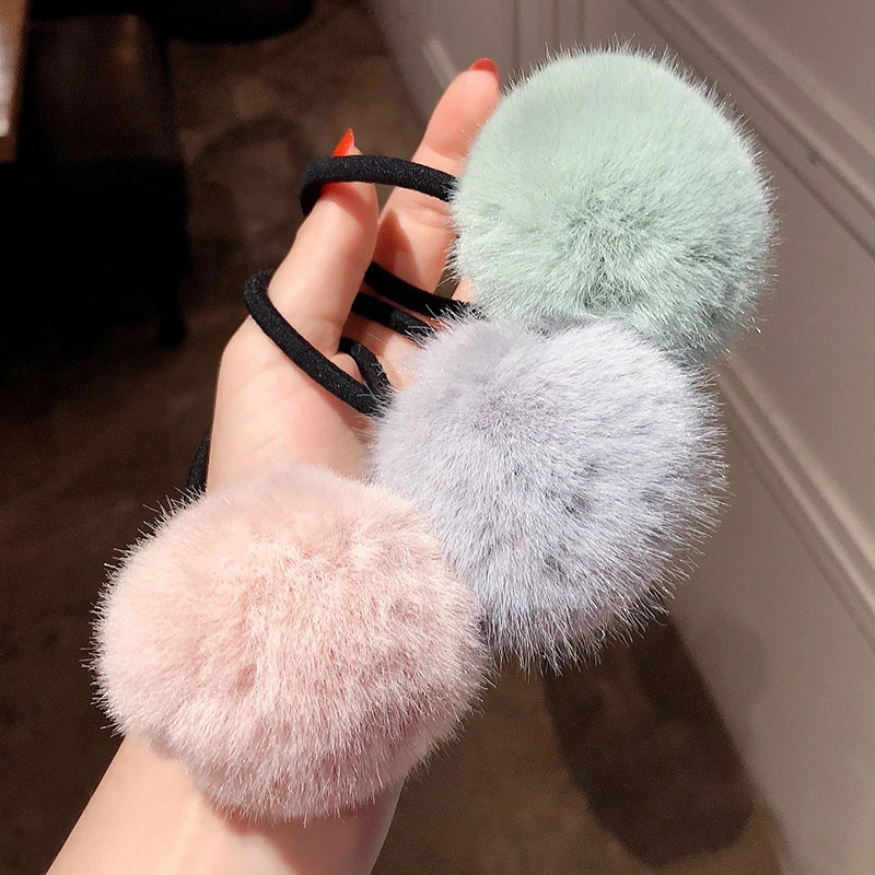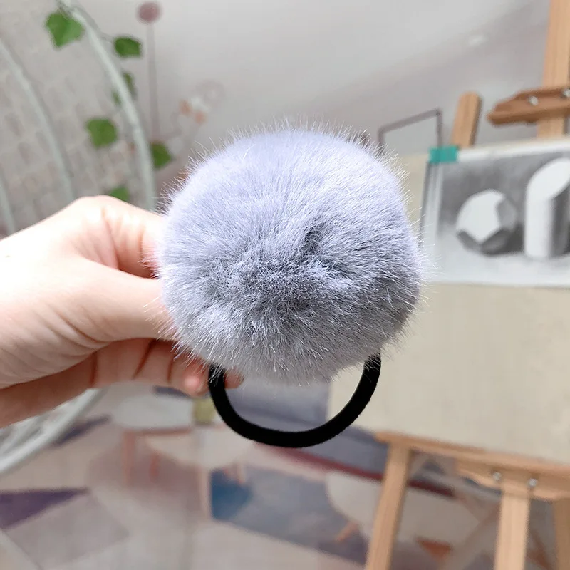 Милые кольца для волос, держатель для хвоста, лента для волос с помпоном для девочек, модная лента для волос с имитацией кроличьего меха плюшевые эластичные, аксессуары для волос