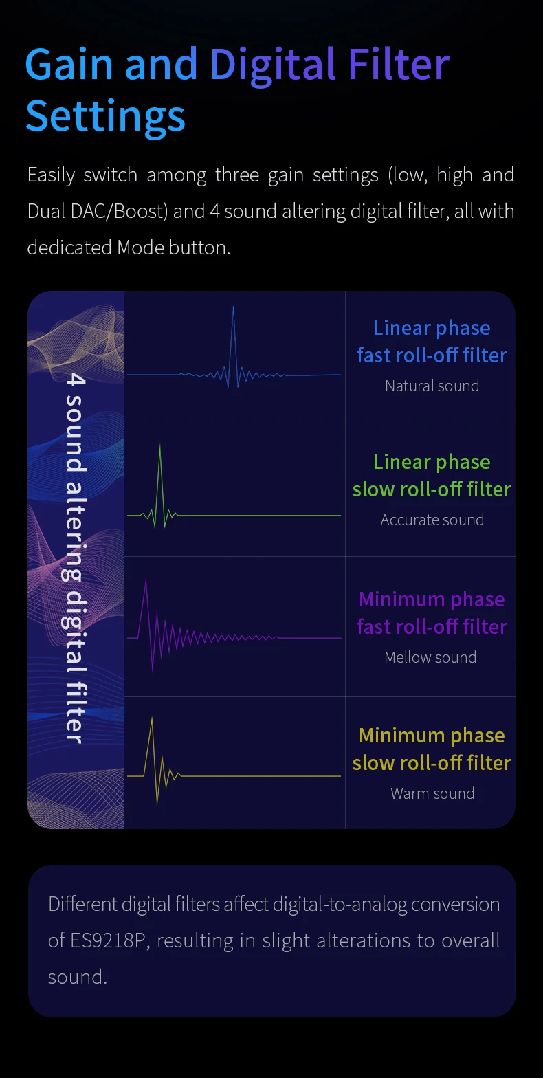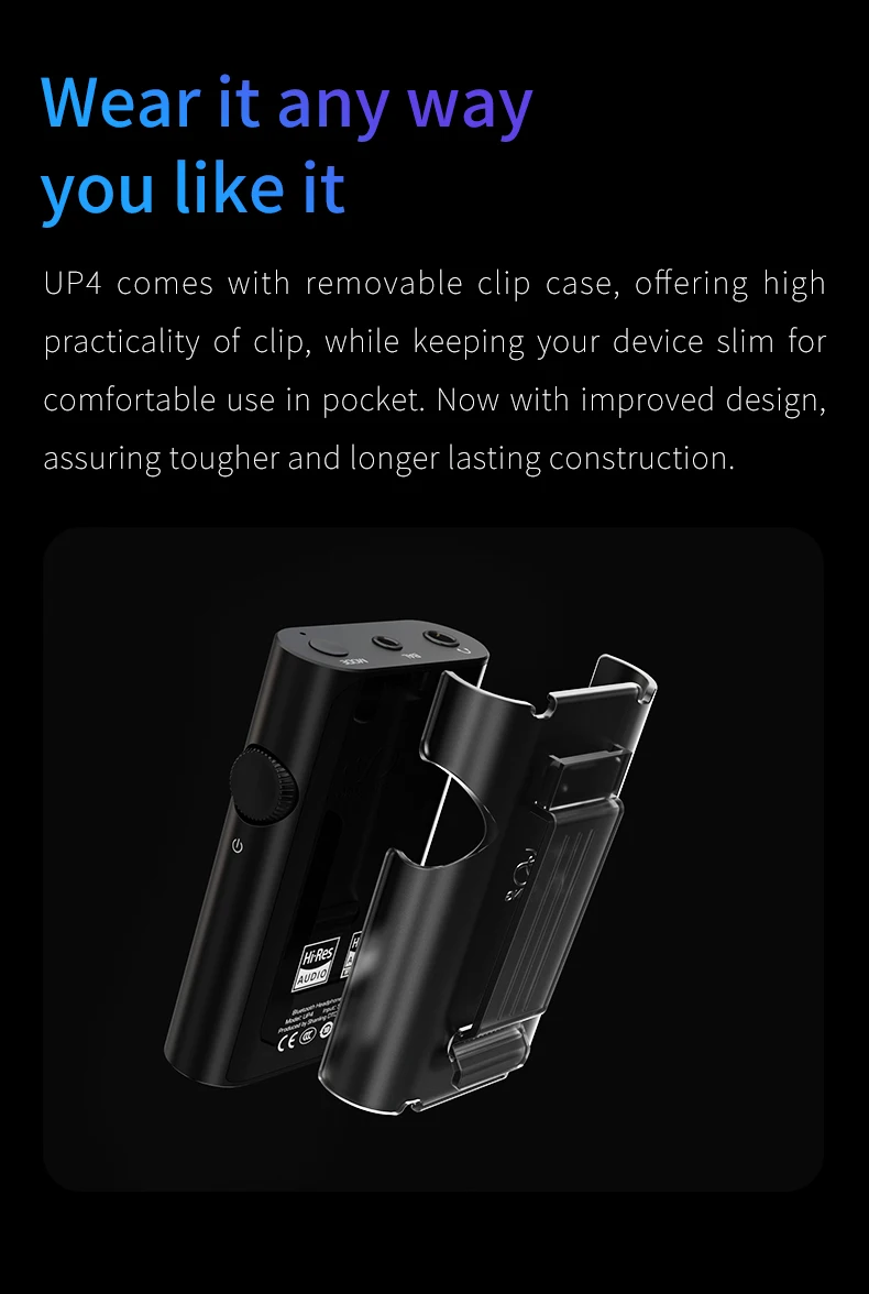 Shanling UP4 Dual ES9218P CSR8675 Bluetooth сбалансированный USB-усилитель ЦАП двойной режим ЦАП сопряжение NFC выход 2,5/3,5 ммСпецификация:-Dual ES9218P DAC/AMP-3,5 мм односторонний и 2,5 мм сбалансированный выход-Режим с высоким коэффициентом усиления/низким коэффициентом усиления/Dual DAC-91 мВт при 32 Ом односторонний и 160 МВт при 32 Ом сбалансированный выход-Сопряжение NFC-Чип Bluetooth 5,0 Qualcomm CSR8675-Поддерживает кодеки LDAC, HWA LHDC, aptX HD, aptX Low Latency, aptX, AAC и SBC-Тонкий и гладкий дизайн для вашего кармана, поставляется с дополнительным чехлом с зажимом-Многофункциональное колесо для полного управления воспроизведением и звонками-Встроенный микрофон для телефонных звонков и голосовых помощников-Может быть подключен к компьютеру для использования в качестве USB DAC-Срок службы батареи до 15 (SE) / 10 (H) часовDAC/AMPЦАП, похоже, такой же, как в Shanling UP2, ES 9218P наследует признанное качество звука популярного портативного плеера Shanling MO. Он обладает высоким разрешением, четким и мощным выходом с низким выходным сопротивлением и при этом очень эффективен.Максимальное подключениеShanling UP4 оснащен новейшими в мире беспроводными ЦАП/усилителями Bluetooth, поддерживает все текущие беспроводные аудио кодеки-такие как AAC, SBC, aptX, aptX с низкой задержкой, aptX HD, LDAC, LHDC и HWA включая аудио Hi-Res. Возможно подключение к любому устройству наивысшего качества. Эта надежная поддержка формата обеспечит отличное качество звука, чтобы дать вашим наушникам новую жизнь, и позволит им снова резонировать с вами эмоционально.Чип Bluetooth Qualcomm CSR8675Чипсеты Bluetooth 5,0 CSR8675 Shanling UP4-это решение премиум-класса с низким энергопотреблением, предназначенное для улучшенных аудиоприложений с поддержкой 24-битной передачи и обработки, благодаря 120 МГц DSP. Этот чип обеспечивает стабильное соединение на больших расстояниях, минимальную задержку и высокую устойчивость к любым помехам.Вход и выходВместо micro-USB у вас теперь есть USB-C, что является желанным дополнением для будущей защиты и более быстрой зарядки от таких банков питания. Вы также можете использовать соединение USB-C для выхода USB-DAC с вашего ПК в проводной конфигурации.Shanling UP4 оснащен односторонним концом 3,5 мм и выходом конца баланса 2,5 мм. И производят большую мощность 91 МВт @ 32Ω (SE) и 160 МВт + 160 МВт @ 32ΩРегулировка усиленияUP4 имеет два режима регулировки усиления: низкий и высокий для поддержания подходящей амплитуды сигнала на его выходе, несмотря на вариацию амплитуды сигнала на входе.Сертификация Hi-resShanling UP4 получает сертификат высокого разрешения как для проводного, так и для беспроводного режима.NfcПо сравнению с UP2, UP4 поддерживает очистку NFC