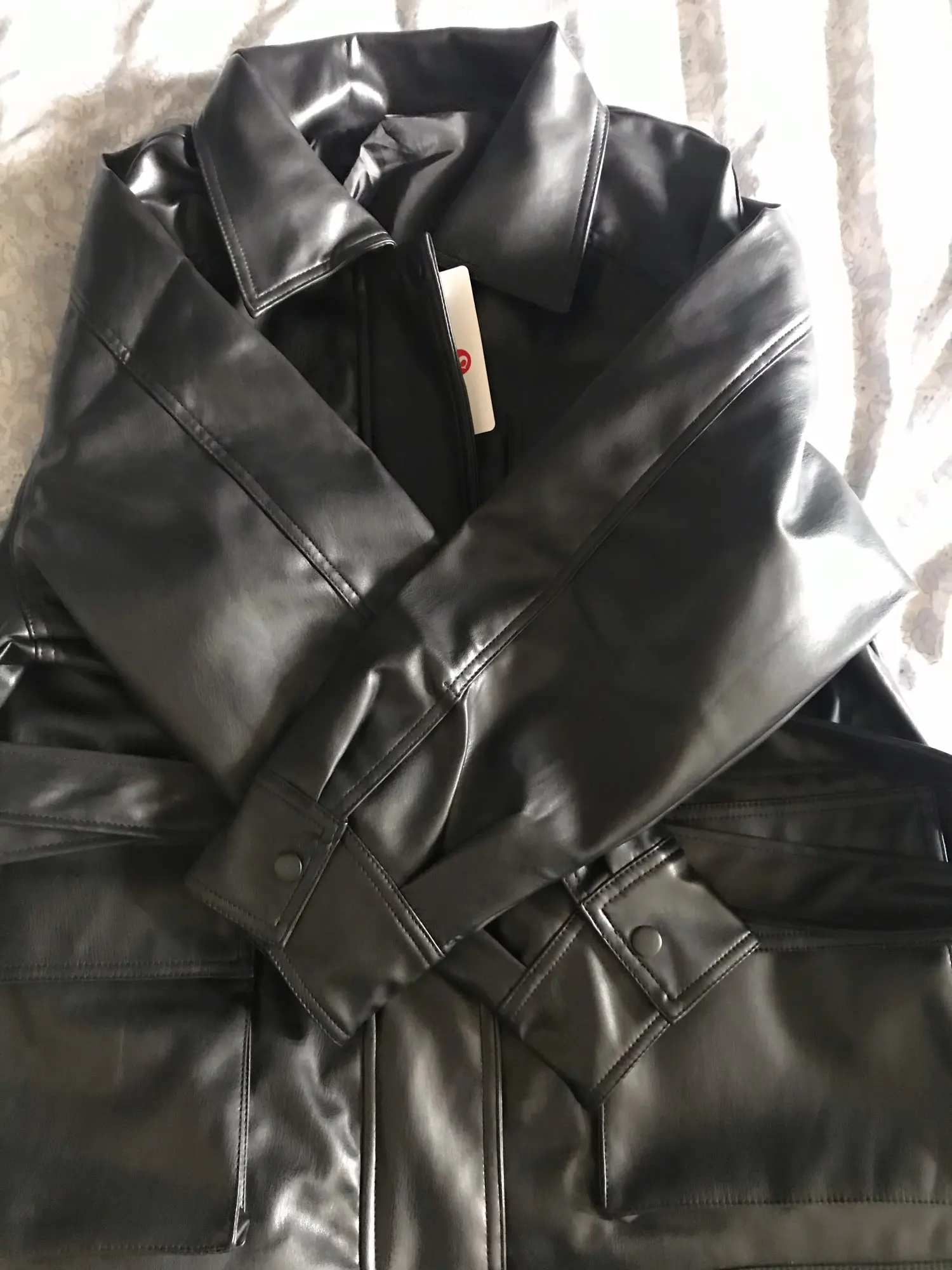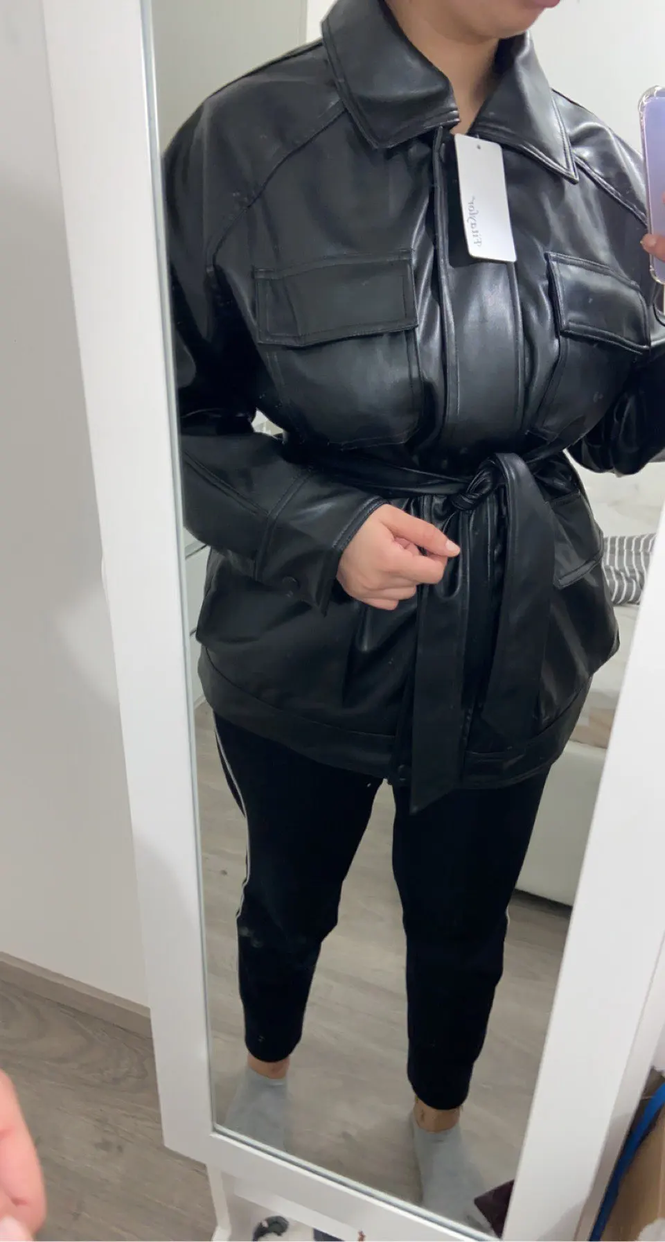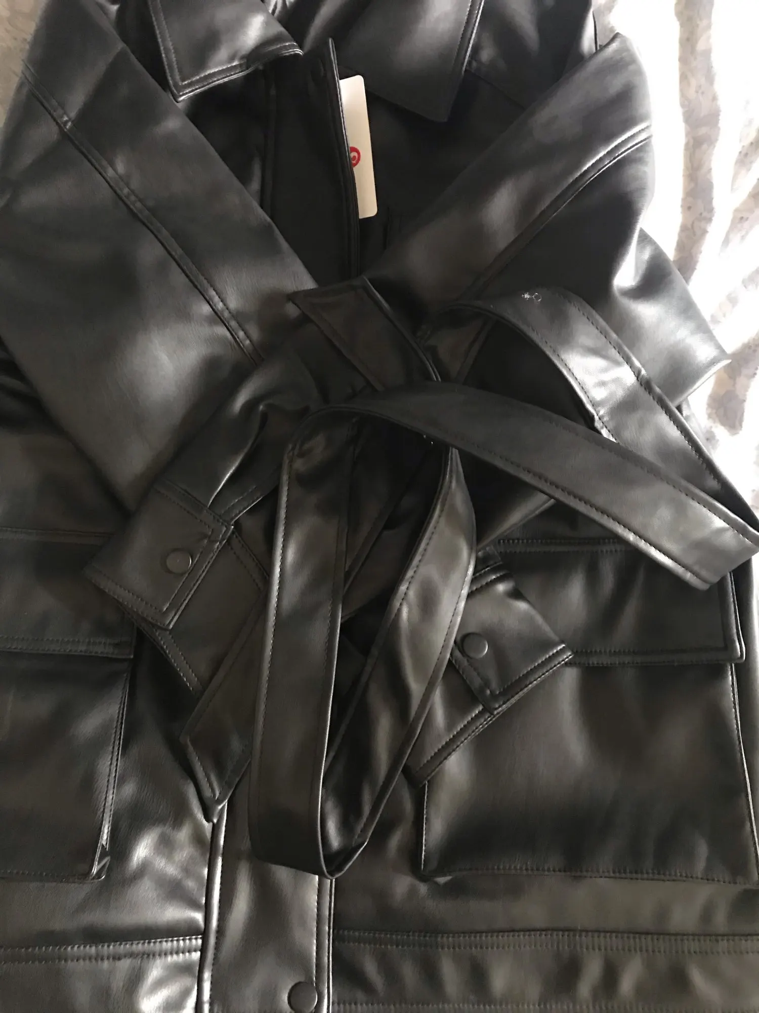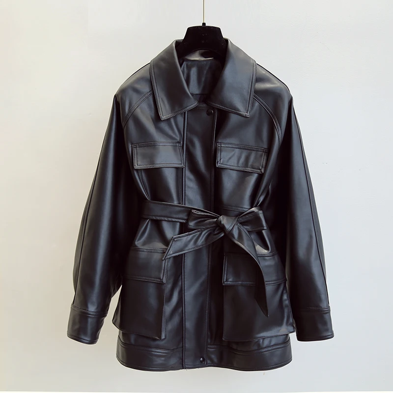 Куртка женская из искусственной кожи, с карманами и завязками на поясе