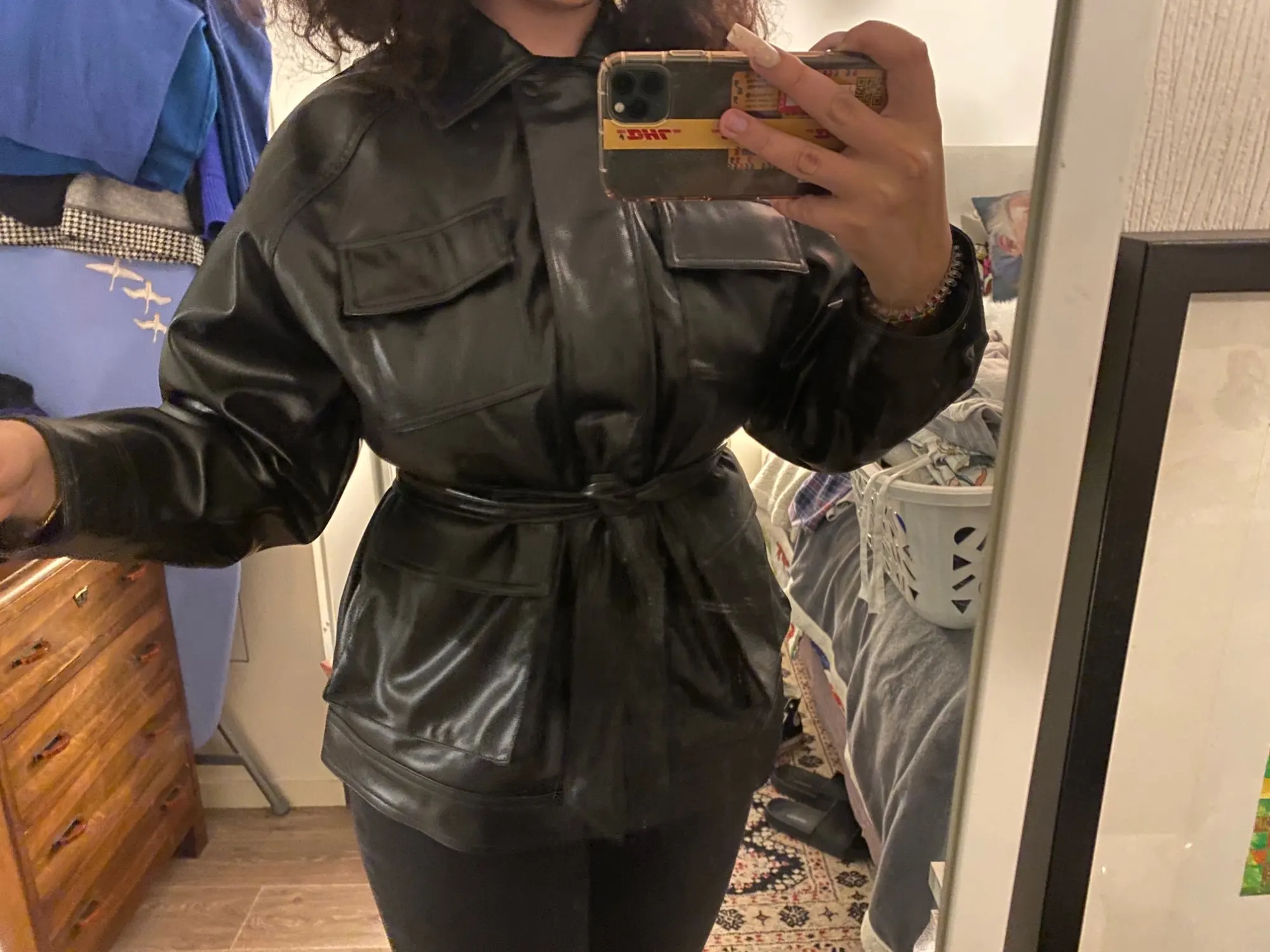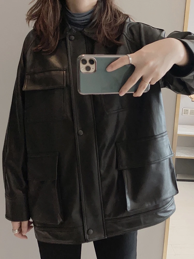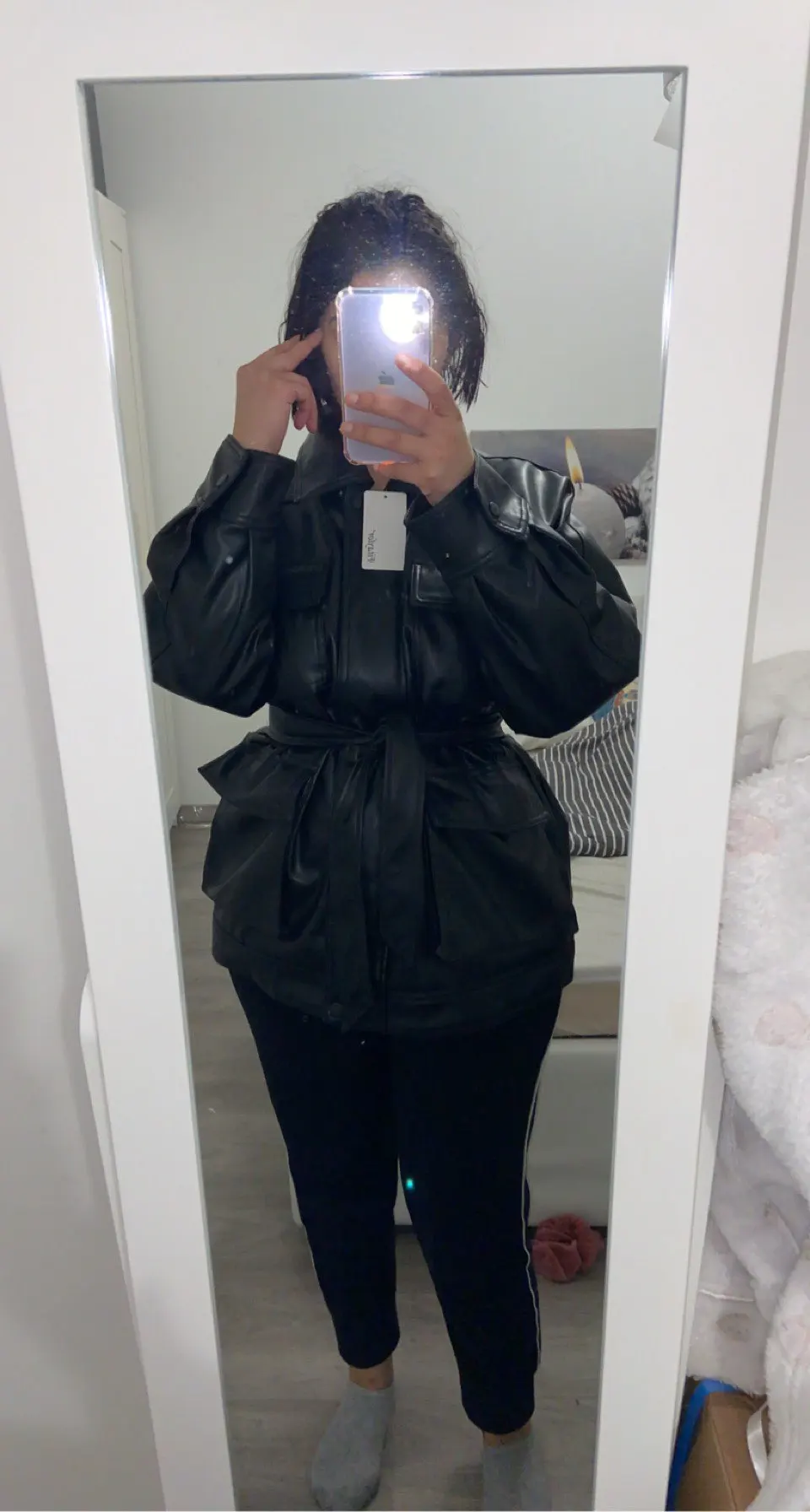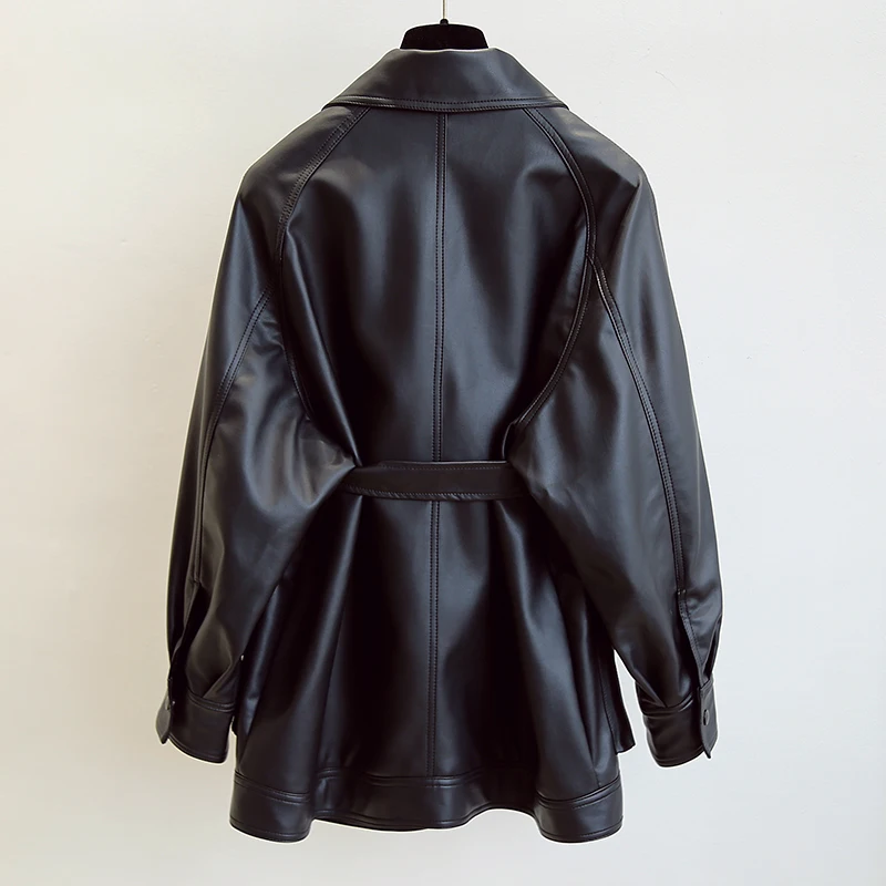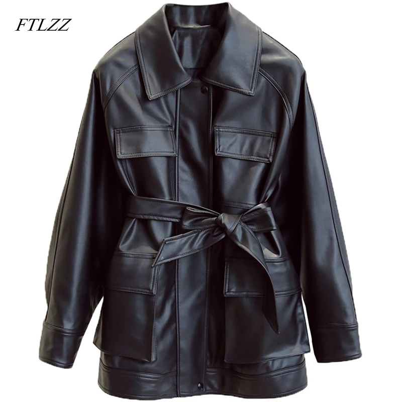 Куртка женская из искусственной кожи, с карманами и завязками на поясе