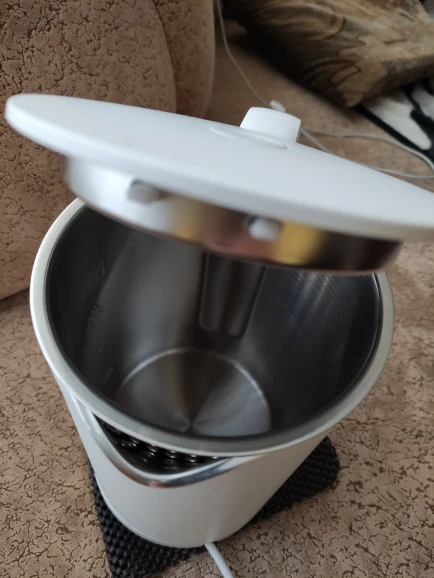 Пришла посылка быстро, чайник приятный на ощупь. Чаша внутри металлическая- нержавейка, шнур,на мой взгляд, короткий. Пока не использовали.