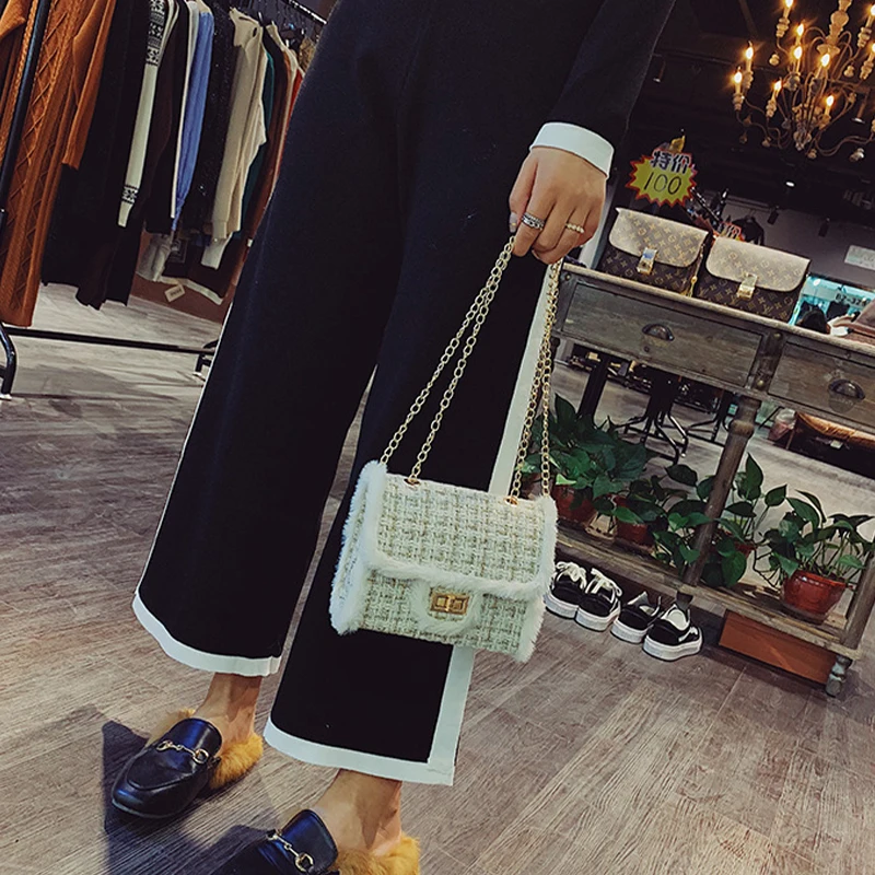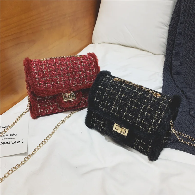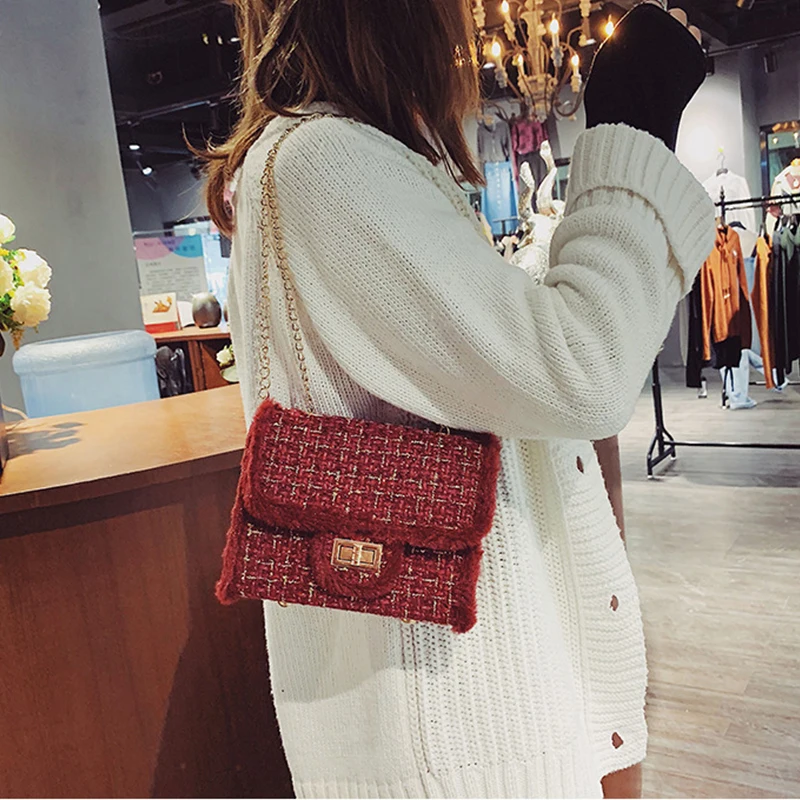 Роскошная женская сумка, плюшевая шерстяная сумка на цепочке, сумки через плечо, маленькие квадратные сумочки, клетчатая женская сумка