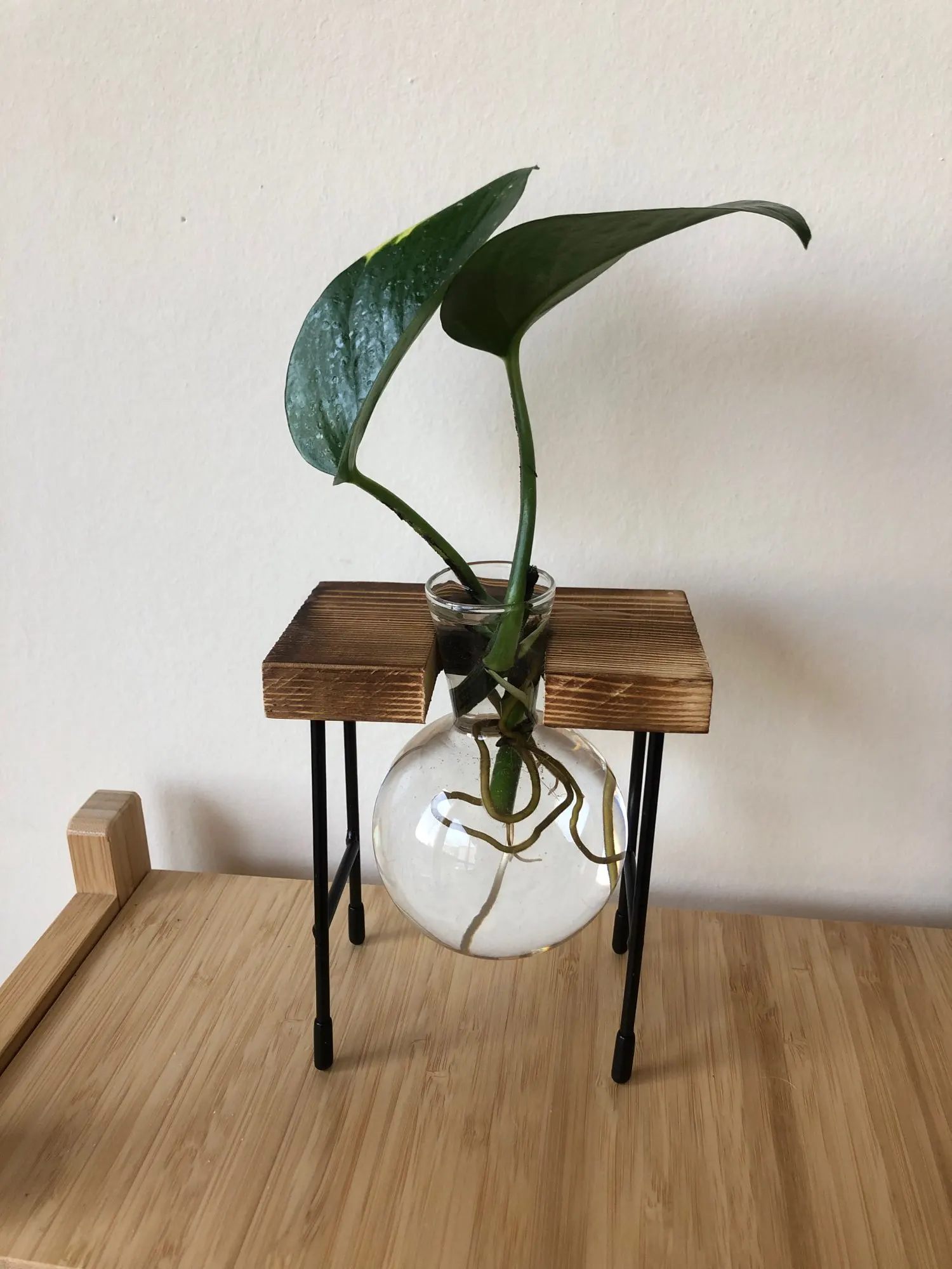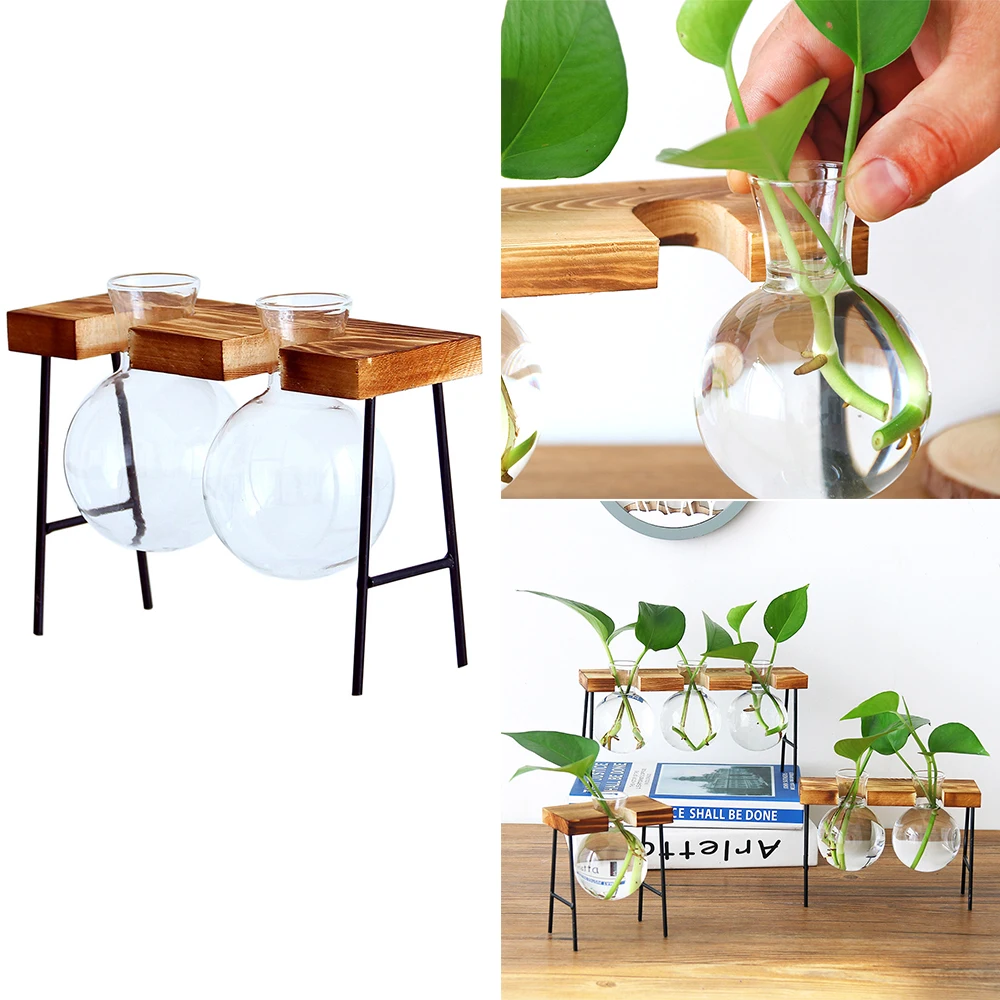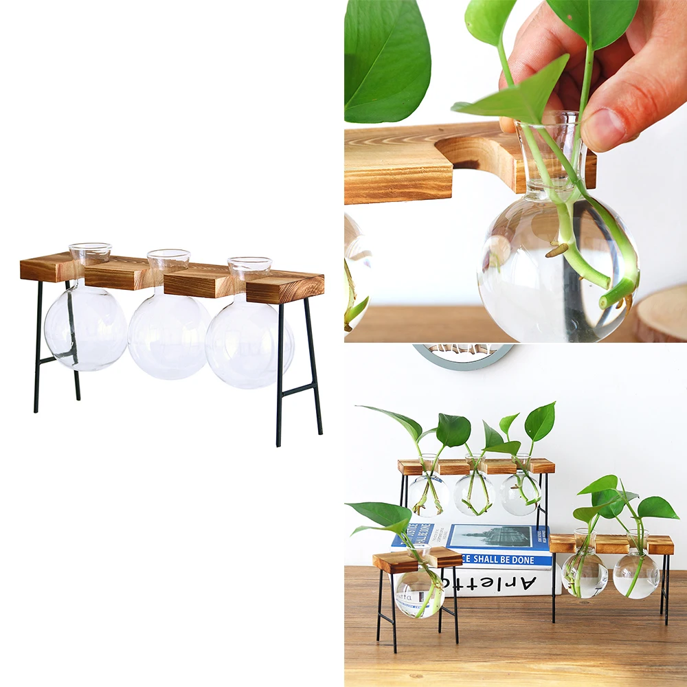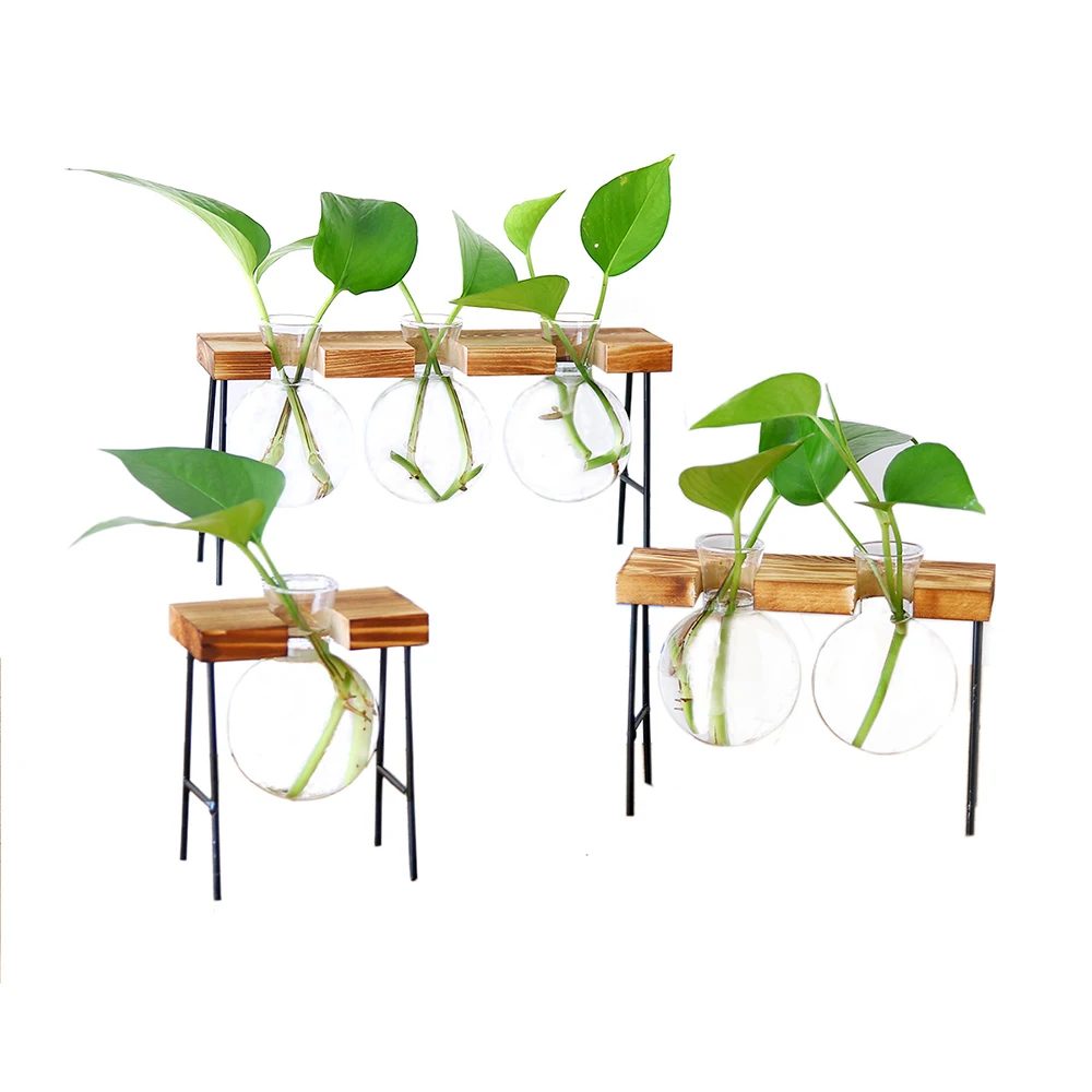Простая Скандинавская стеклянная ваза для цветов, бутылка-тюбик для гидропонных систем, контейнер для террариума с деревянной железной подставкой, настольное украшение