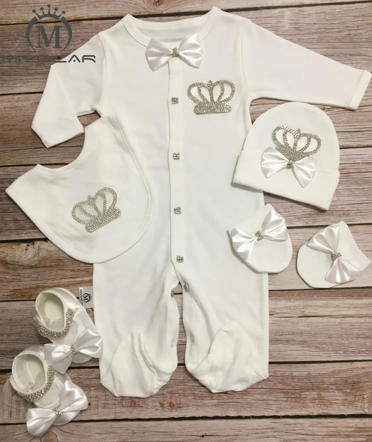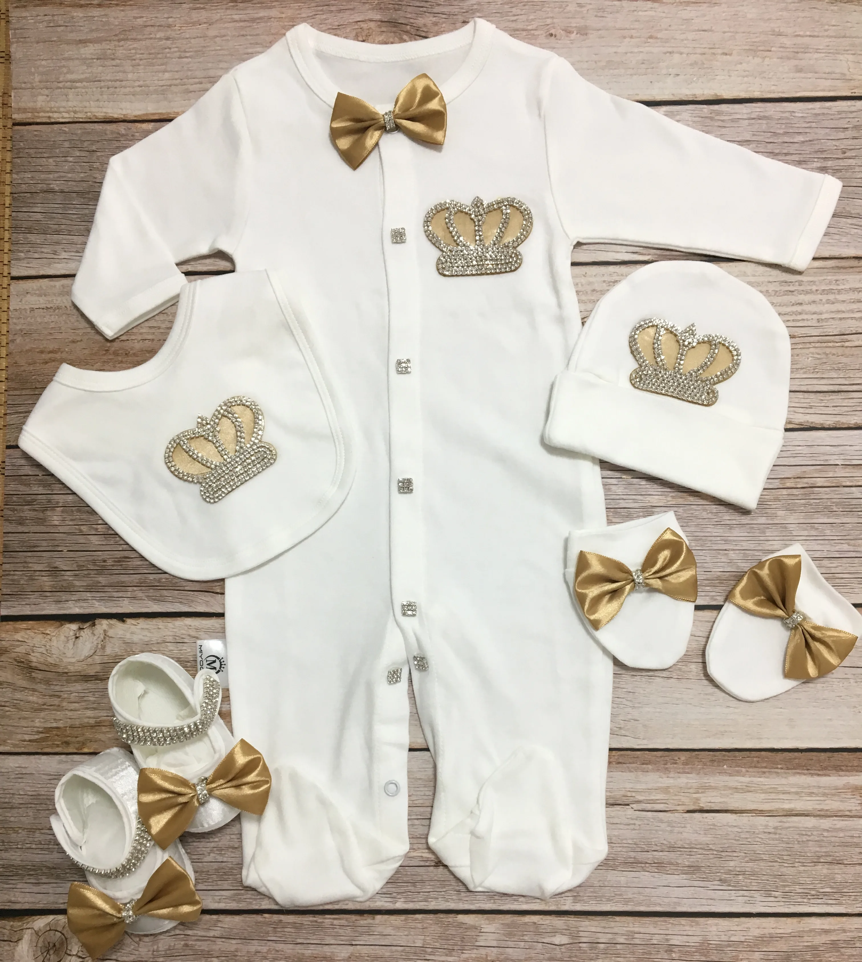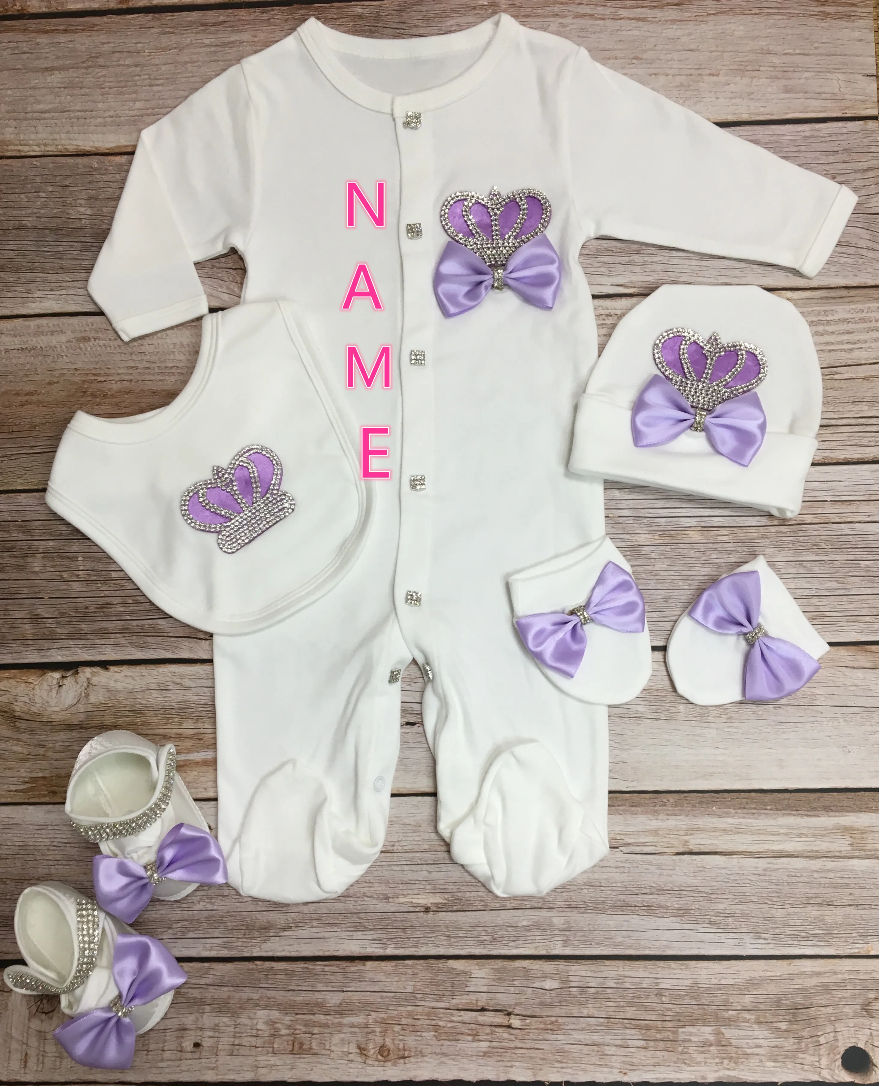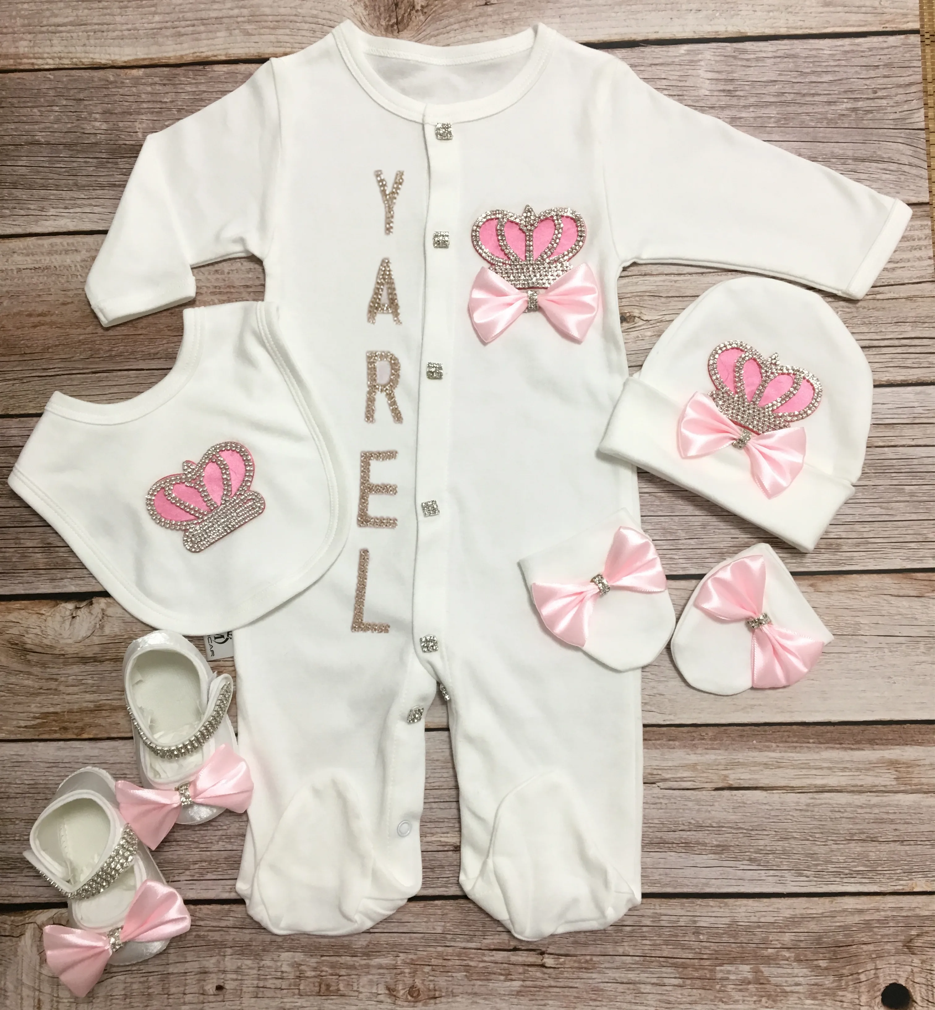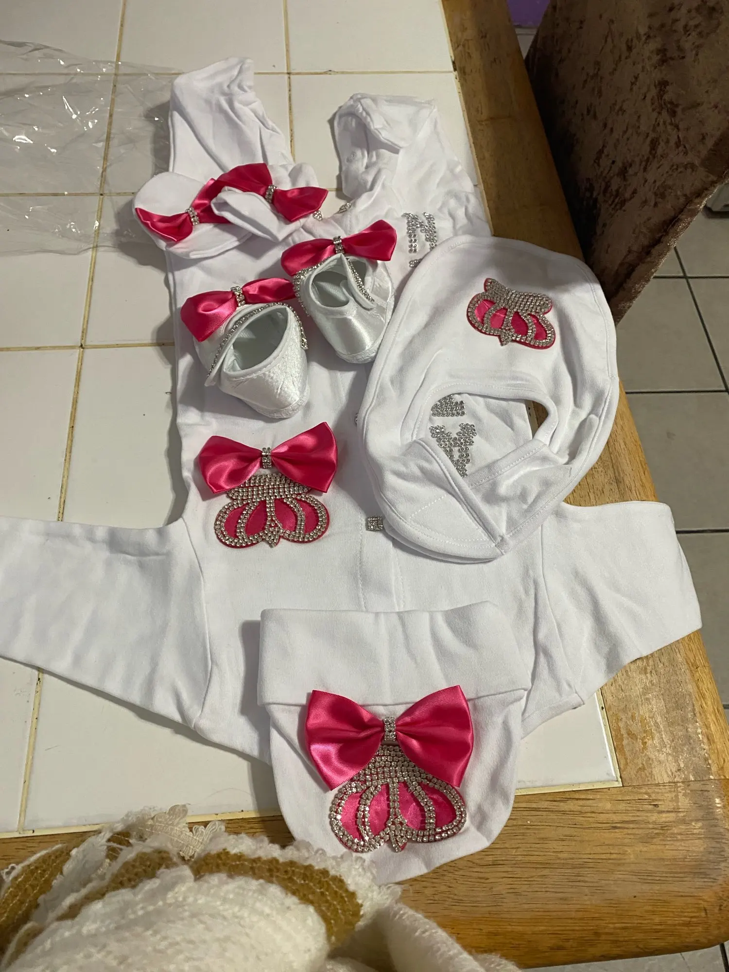 Сколько штук приносят: всего 5, один пиенс, шапка, слюнявчик, обувь и детские перчатки.