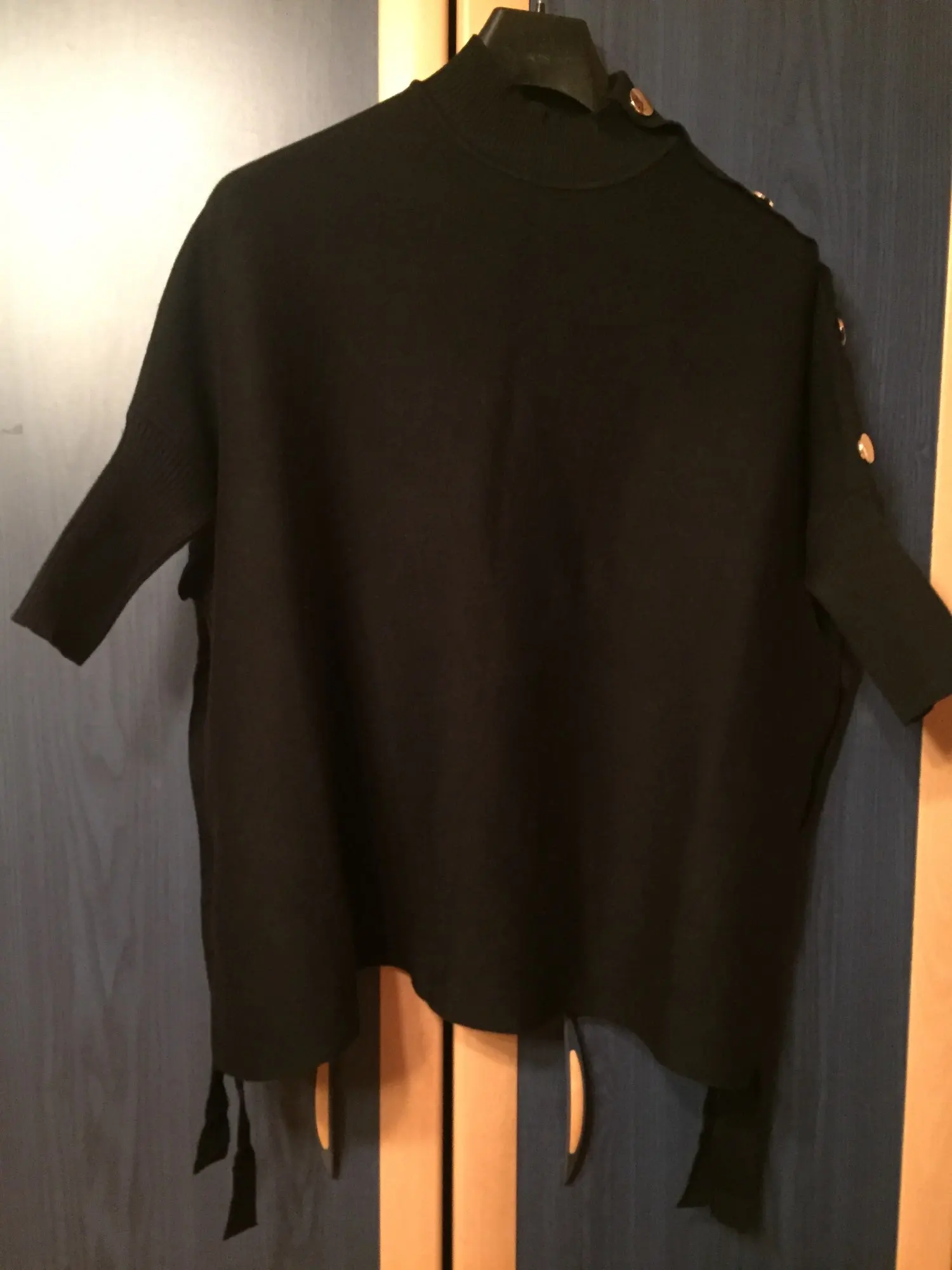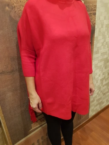 Из плюсов: доставка быстрая, цвет как на картинке, яркий, на ощупь мягкий, приятный к телу, синтетика, на размер 42-44 выглядит как на картинке, из минусов: нижняя кнопка выпала при первой же примерке, ещё несколько держатся на "соплях" под ними начала распускаться ткань. Пуловер так, на один сезон, задумка хорошая смотрится хорошо, но... на мой взгляд своих денег при таком качестве не стоит.