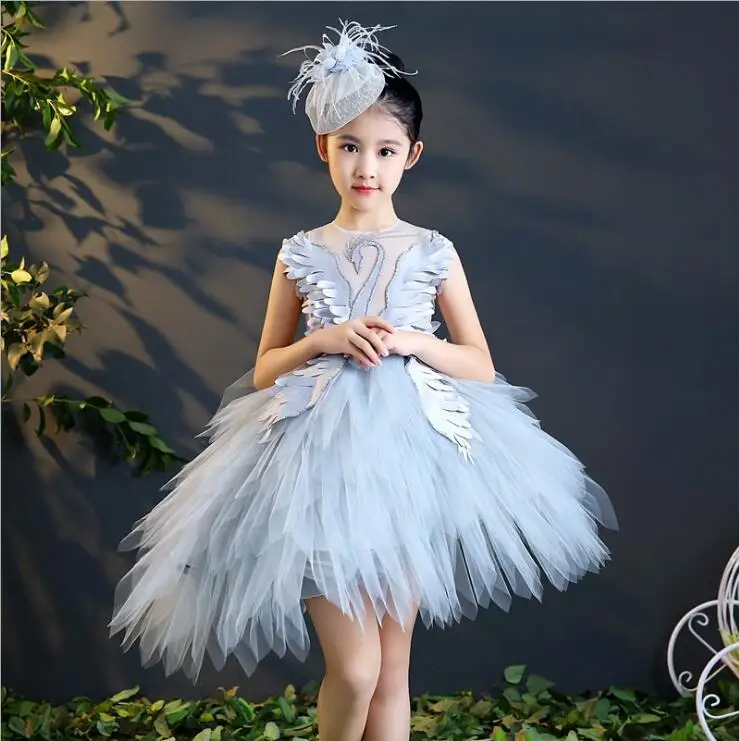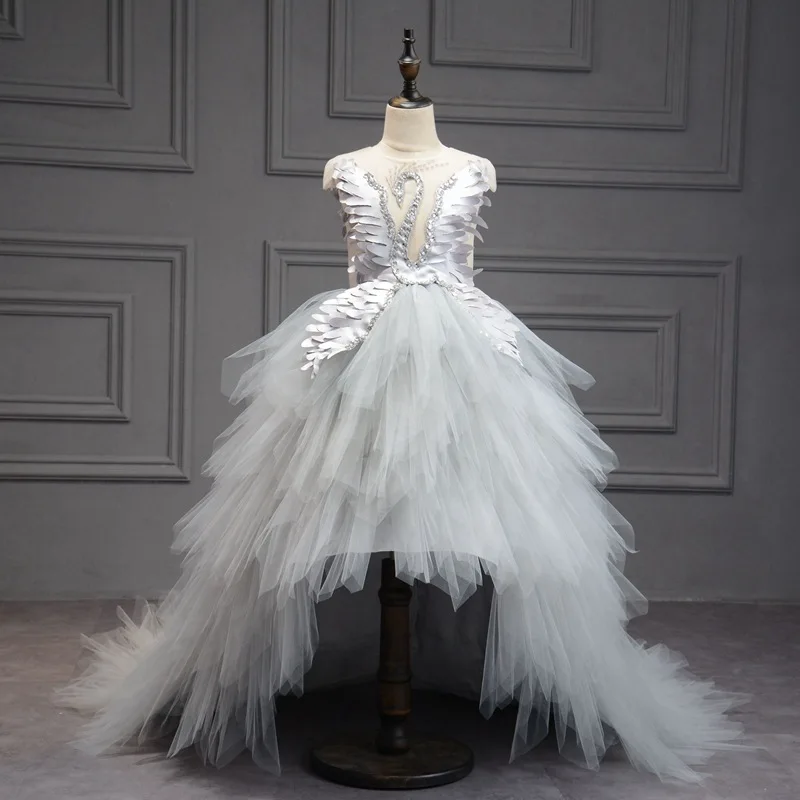 Детское бальное платье, Тюлевое, с лебедем, со шлейфом, с перьями