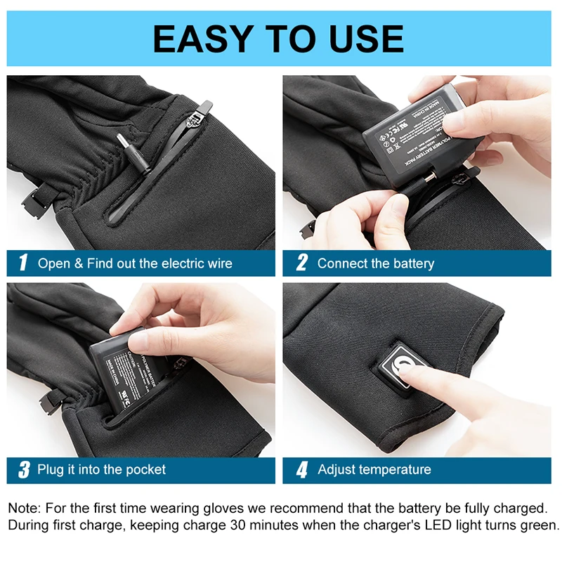 Брал перчатки для езды на велосипеде. Не очень понятно на какую погоду они рассчитаны? Если брать около 10 С, то и без подогрева есть значительно более дешевые перчатки. Меньше 5 С, этих перчаток недостаточно, если едешь на велосипеде, даже на максимальной мощности. Они очень сильно продуваются. Приходится сверху одевать еще одну пару. Кончики пальцев не греются, только первая фаланга.