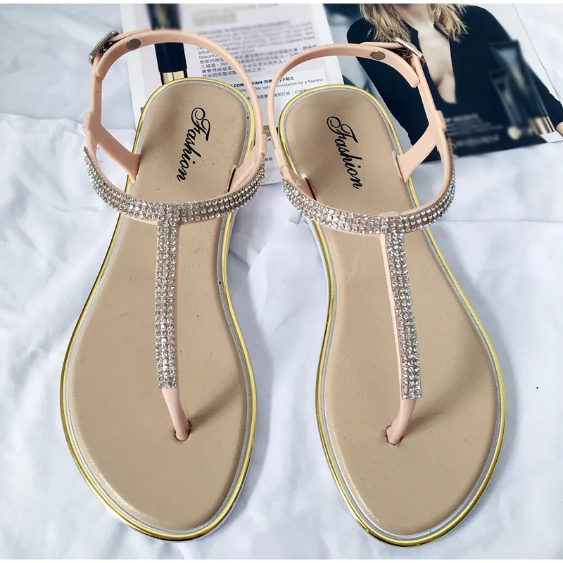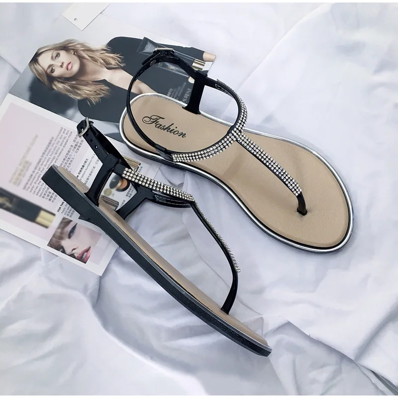 Новинка; Женские сандалии на плоской подошве; Модная повседневная обувь со стразами и Т-образным ремешком; Женские пляжные сандалии с пряжкой; Женские Вьетнамки; Женская летняя обувь