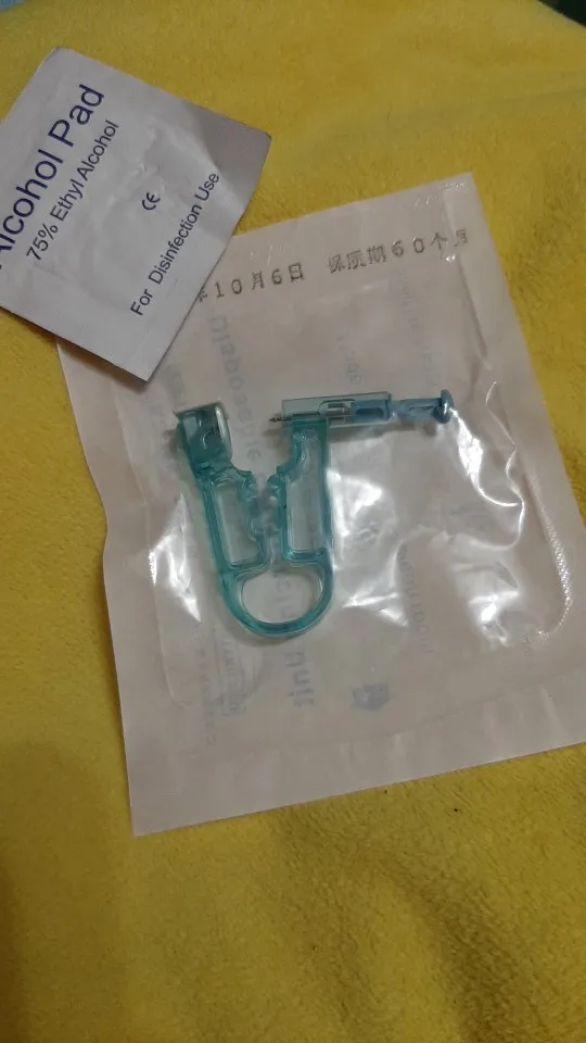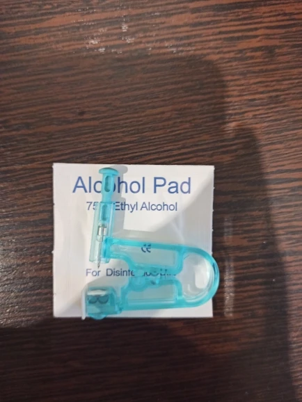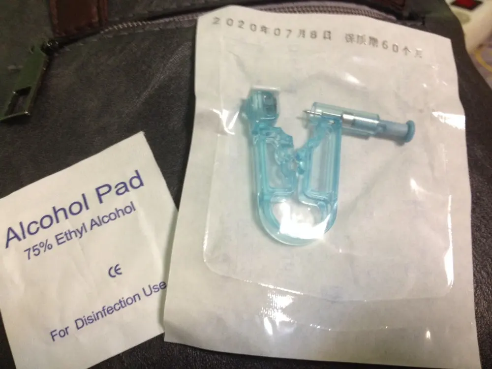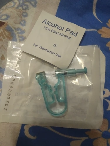 В комплекте также шла маленькая спиртовая салфетка. удобно в использовании, прокол был осуществлён быстро и почти безболезненно. Можно вставить серьгу обратно и прокалывать повторно