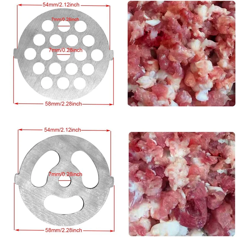 5 шлифовальных пластин и 2 режущих лезвия для запасных частей мясорубки и измельчителя пищевых продуктов. Подходит практически для всех шлифовальных машин и мясорубок размером 55 мм, с центральным отверстием 7 мм.