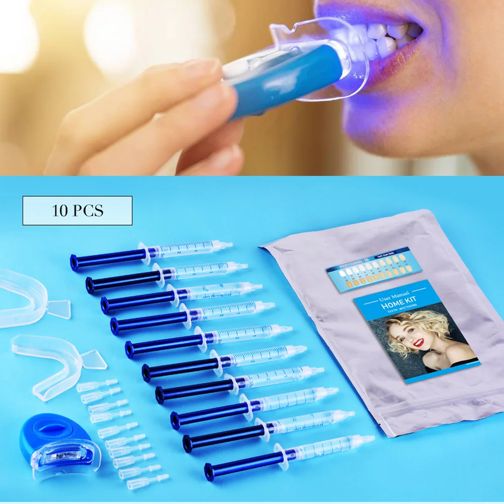 -1 * Лампа для холодного отбеливания (синяя) -2 * арочные лотки -10 * отбеливающий гель (3 мл шт) -1 * Руководство пользователя -1 * Руководство по оттенку зубов.