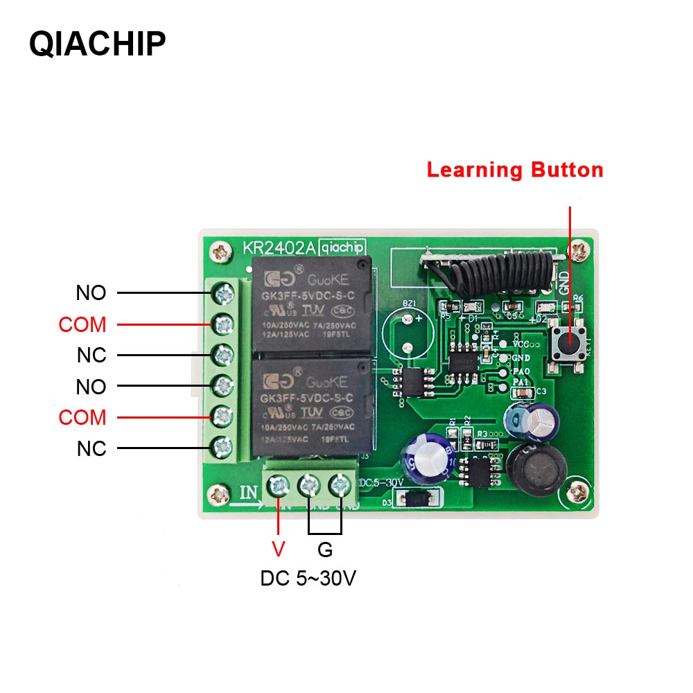 Нажмите кнопку обучения на приемнике один раз, он приходит в мгновенный режим настройки.Подождите немного, светодиодный индикатор выключится, он войдет в состояние обучения.Нажмите кнопку дистанционного управления, светодиодный индикатор на плате приемника будет мигать, а затем выключается.Через 3 секунды светодиодный индикатор будет включаться снова и успешно учится.