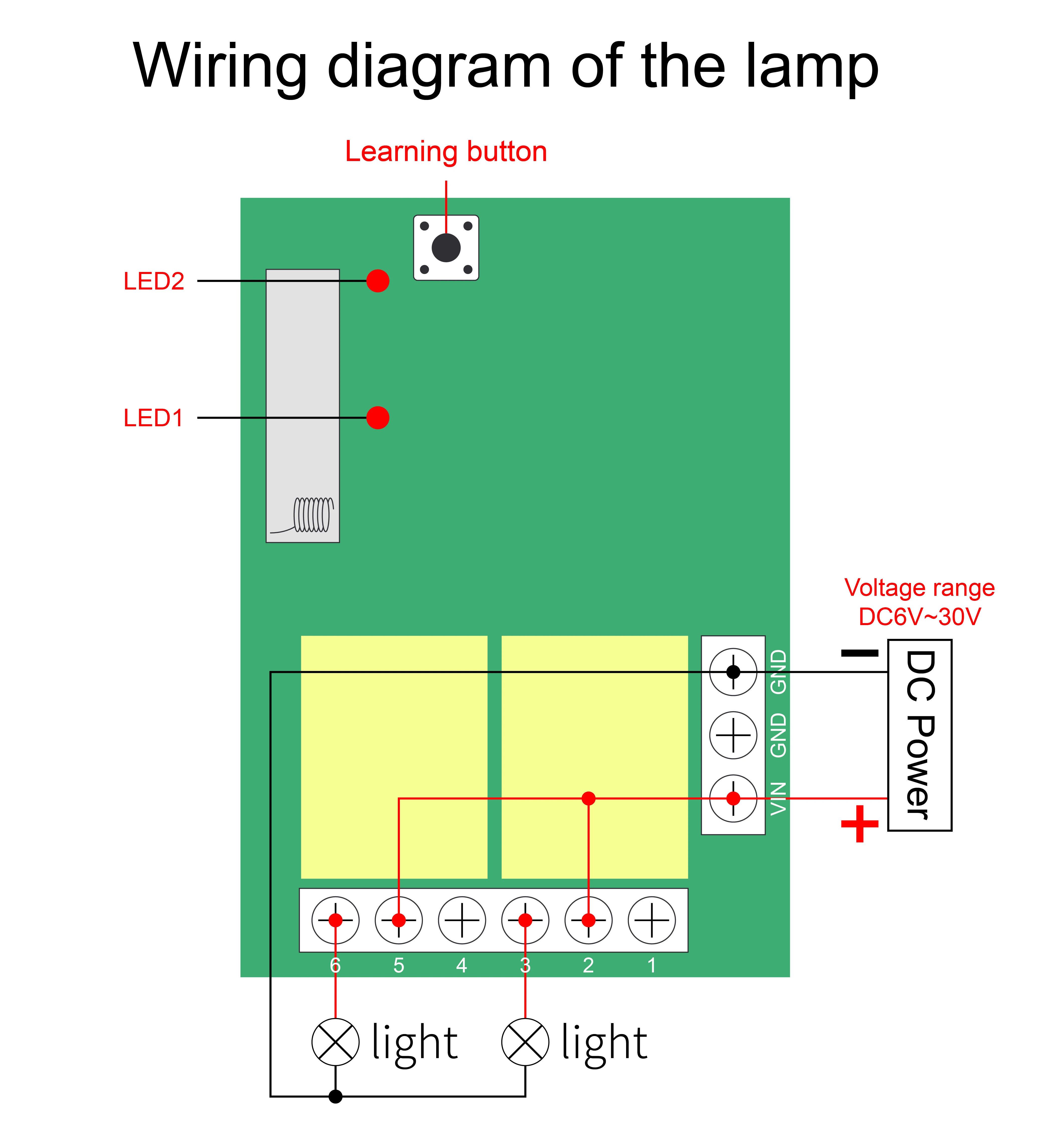 Первый шаг: Очистите память приемникаНажмите кнопку обучения на приемниках в течение 8 раз, коды будут очищены.После очистки кода, все пульт дистанционного управления больше не может работать.Шаг 2: дистанционный передатчик и приемник с настенной панельюНажмите клавишу обучения на приемнике дважды, она переходит в режим переключения.Подождите немного, светодиодный индикатор включится, он войдет в состояние обучения.Нажмите кнопку дистанционного управления, светодиодный индикатор на плате приемника будет мигать, а затем выключаетсяОбучение успешно.