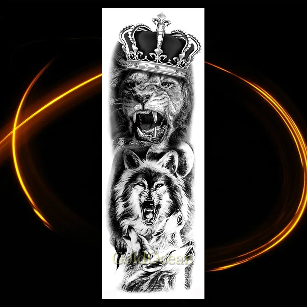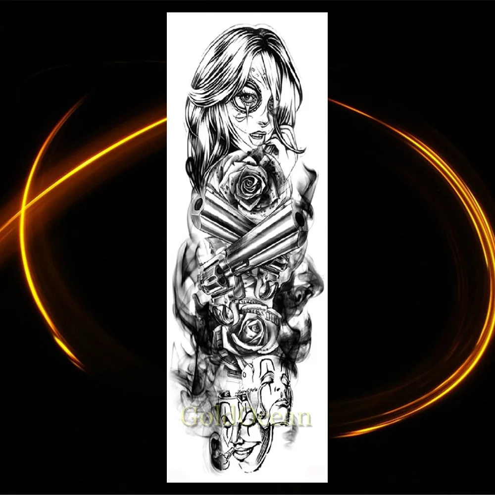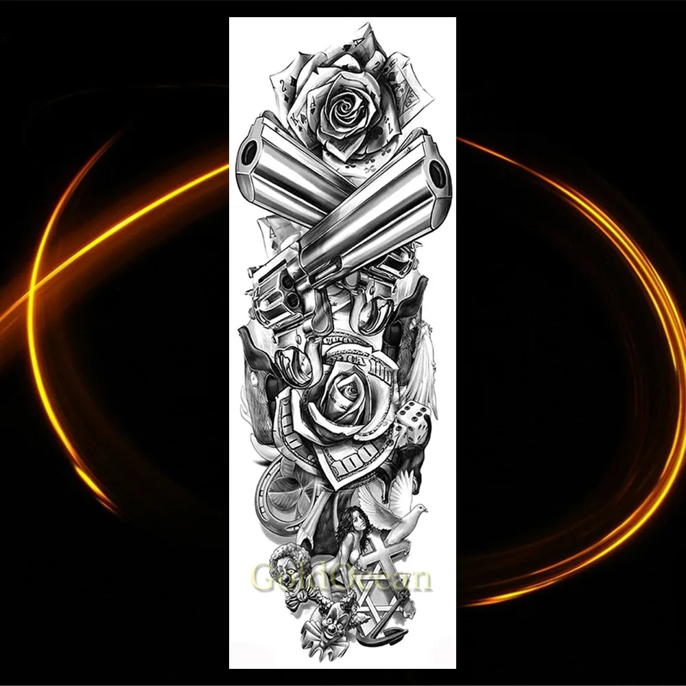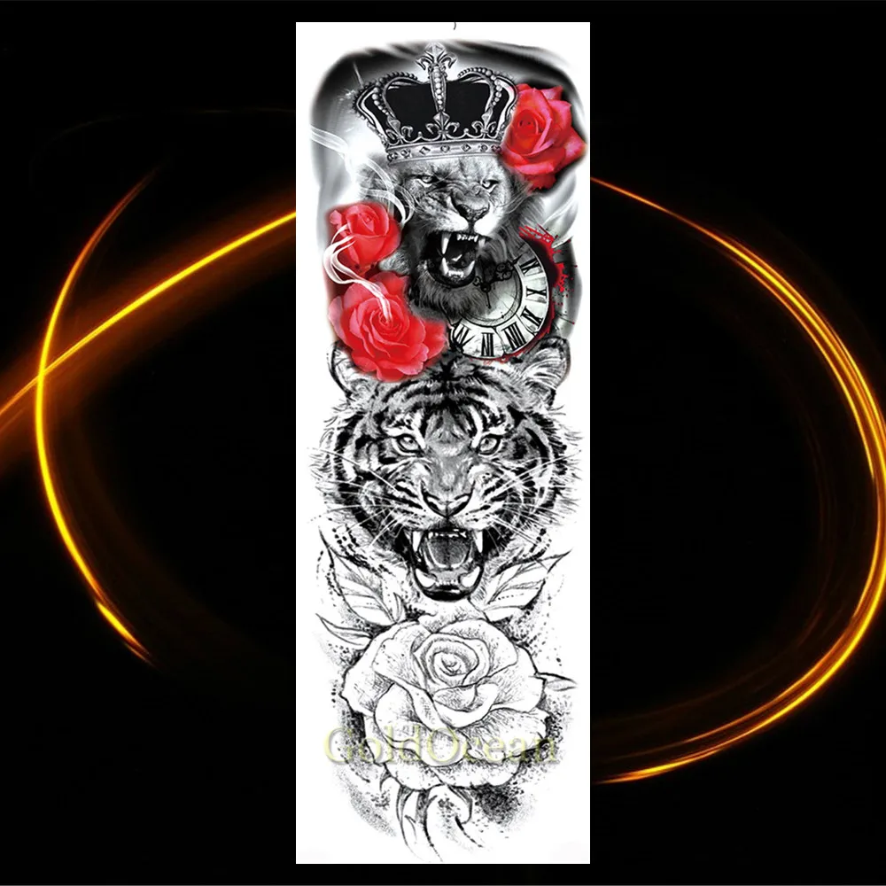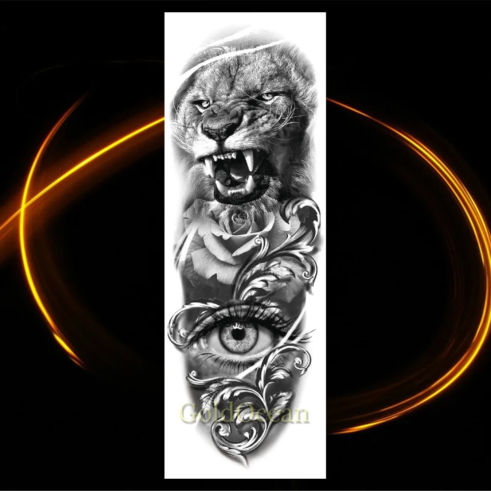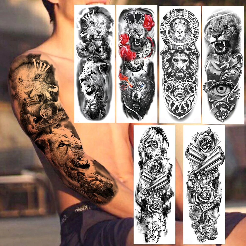 Свирепый лев военные Временные татуировки Реалистичная поддельная на всю руку темный угол пистолета Роза с длинным рукавом тату наклейка для женщин мужчин