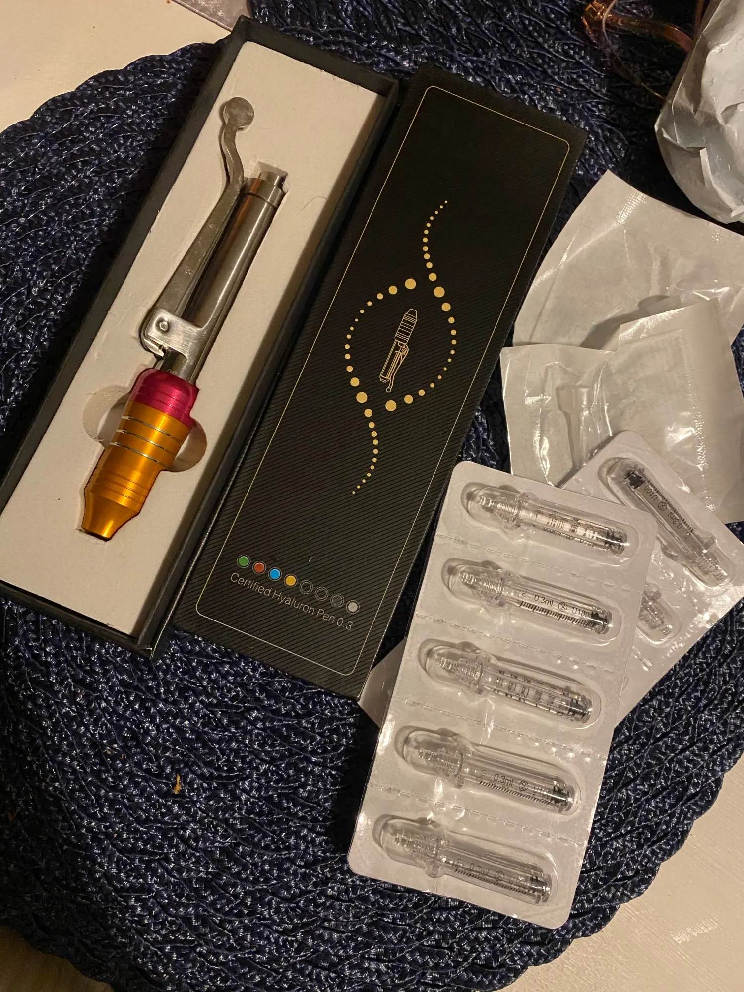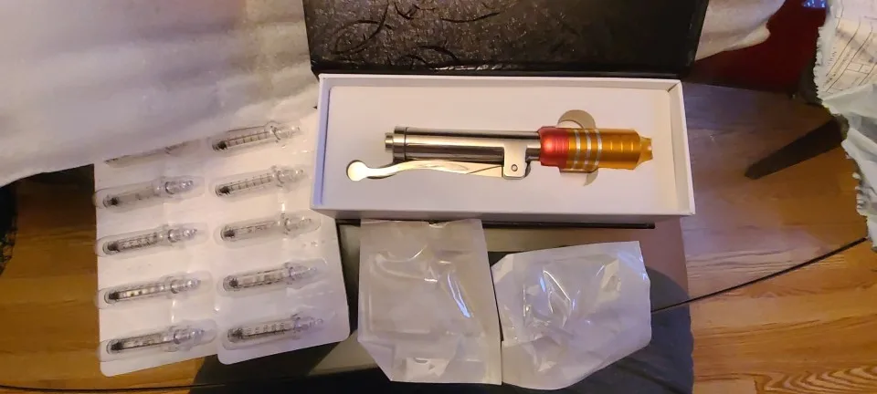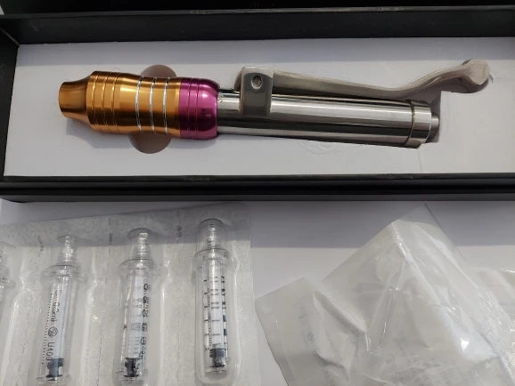 I have received it. Пистолет как есть, с 5 пустыми шприцами и иглой. Хорошие вещи. Я попробовал это без использования иглы и с гиалуроновой кислотой (не купленной на aliexpress), и я оценил, что с жидким зарядным шприцем, и он выходит с достаточным давлением. Принесите иглу, которую я не использовал, потому что я боюсь. Сила, которая выходит под давлением, может вызвать повреждения. Гиалуроновая кислота купит его у бренда, одобренного этим. В восторге, аллерган...