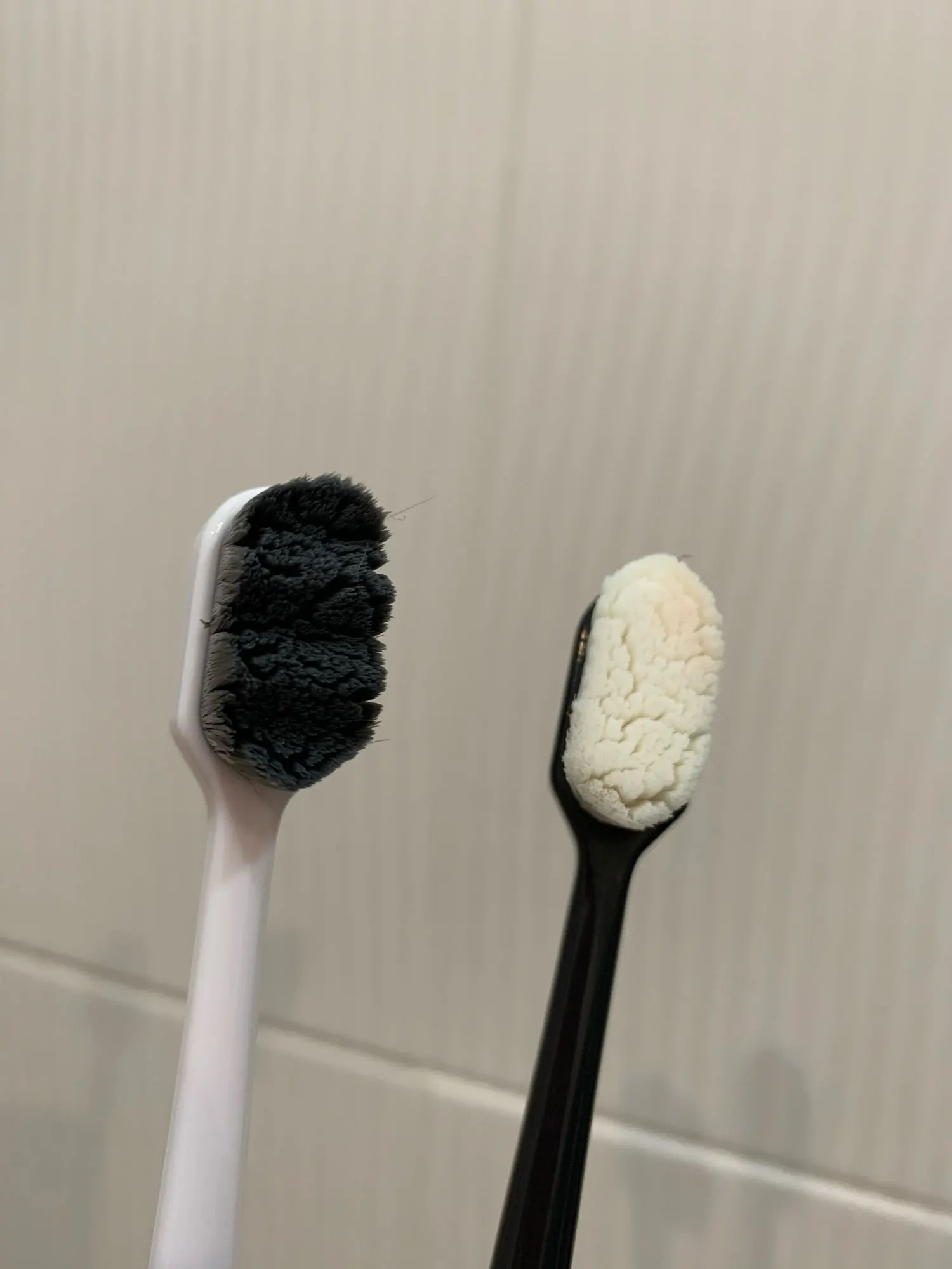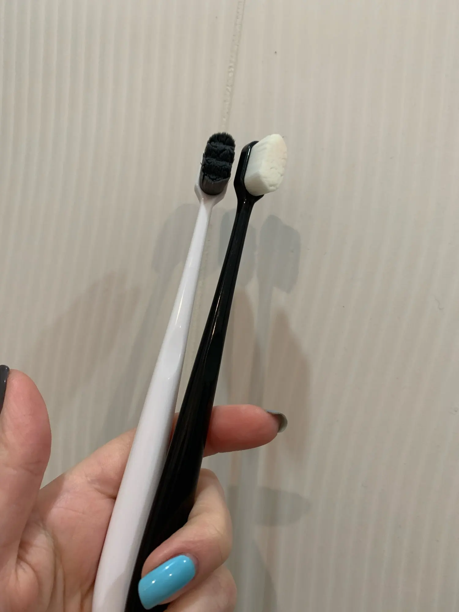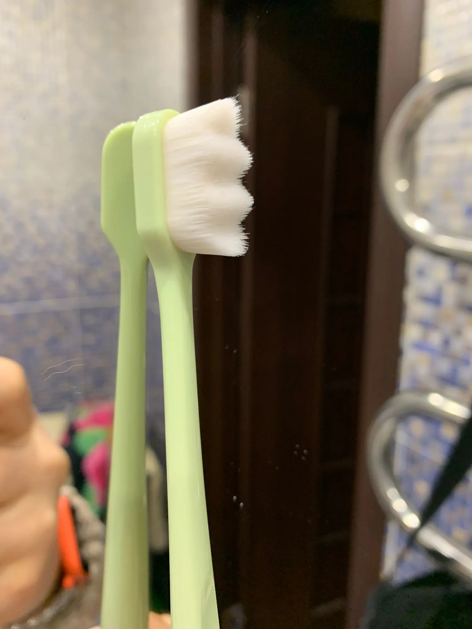 Очень мягкие и плотно набитые щетинки, не травмируют дёсны, отлично! Фото в сравнении с ультра мягкой щёткой из магнит косметик.