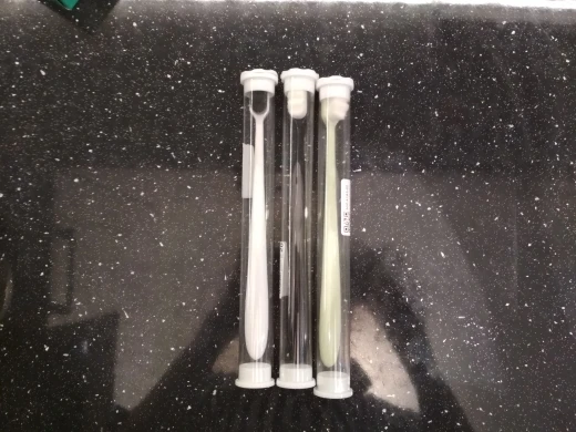 Щётки дошли за 19 дней. Упакованы каждая в свой футляр и в простой полиэтиленовый пакет. Дошли в целости. Щётка небольшого размера . Щетина мягкая и плотная. Такие щётки хорошо подойдут тем у кого чувствительные зубы. Мне понравились. Чистить комфортно.