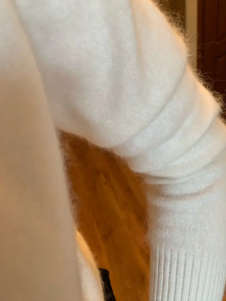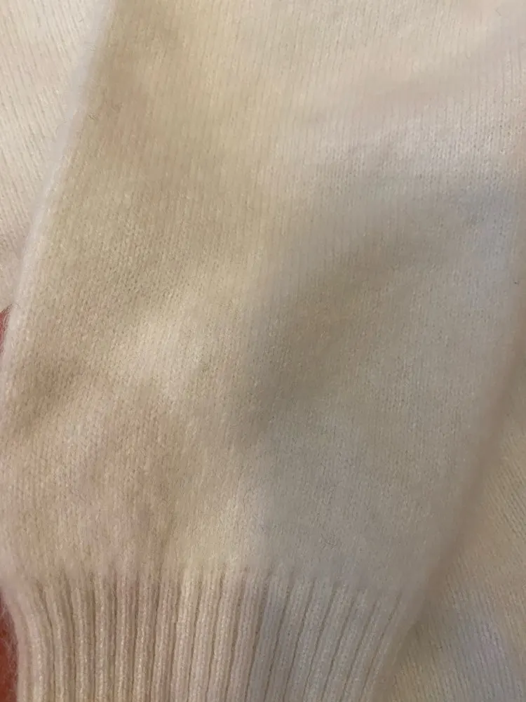 Заказала кофту 13.11 пришла 22.12. Взяла размер М, по совету продавца, на парамметры рост 160, ог 84, ширина плеч 37, длина рук 53. Сама кофта мягка, приятна, не много колится ворот, цвет скорее молочный, а не такой белоснежный как на фото. Длина в рукавах хорошая, а вот во всём остальном хотелось бы на размер меньше. Собирается в районе воротника и от плеча до груди, но это и видно на фото продавца и других покупателей, но я почему-то не обратила внимание. Больше всего меня расстроили пятна, надеюсь на фото видно. При ближайшем рассмотрении стало понятно, что это просто нити такого оттенка, но дело в том, что они смотрятся как грязные пятна и портят весь вид(( ладно если бы они были в одном месте, можно было надеть брошь, но их несколько на разных частях кофты и в частности у воротника, что очень заметно. Что делать с ними не знаю(