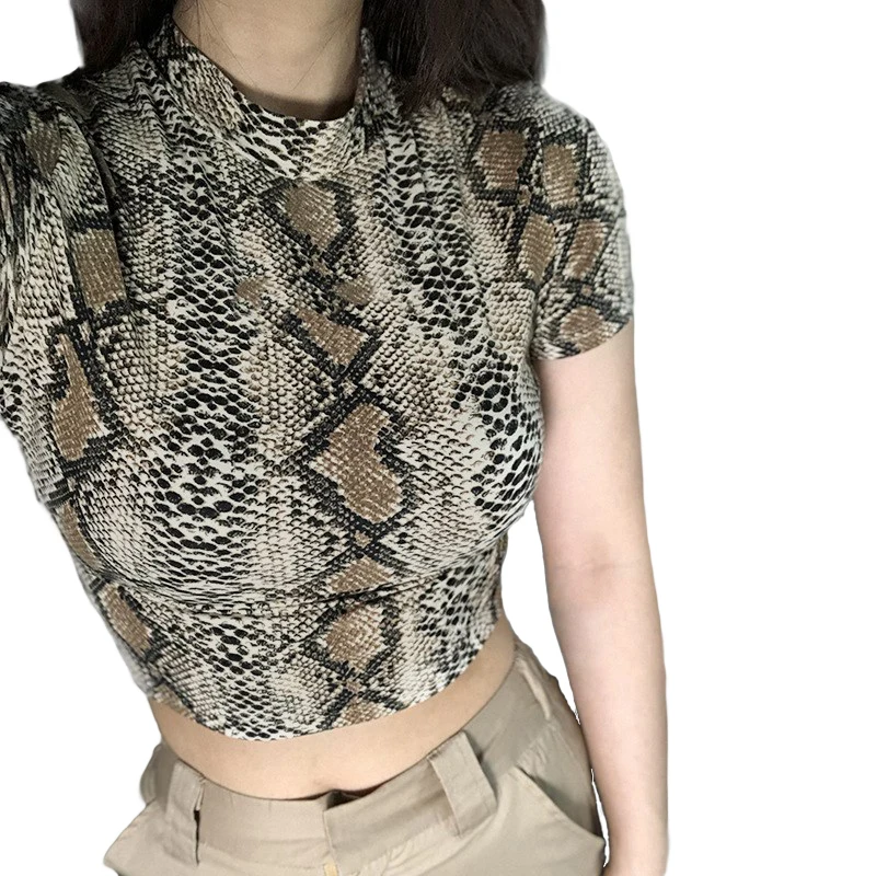Женский укороченный топ со змеиным принтом, облегающая футболка с высоким воротником, модная эстетичная футболка в стиле Харадзюку, лето 2020