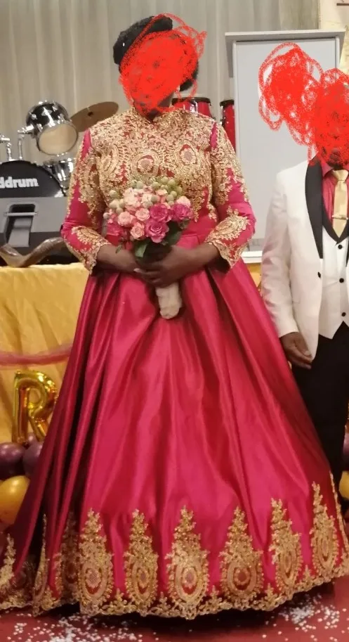 Винтажное мусульманское свадебное платье E JUE SHUNG с золотыми кружевами с длинным рукавом и высоким воротом аппликации бордовые Свадебные платья платье свадебное платье