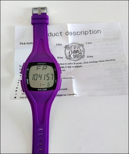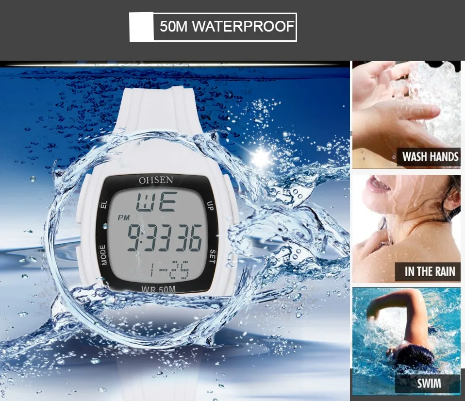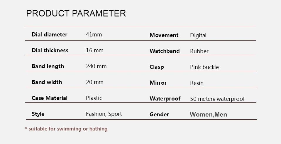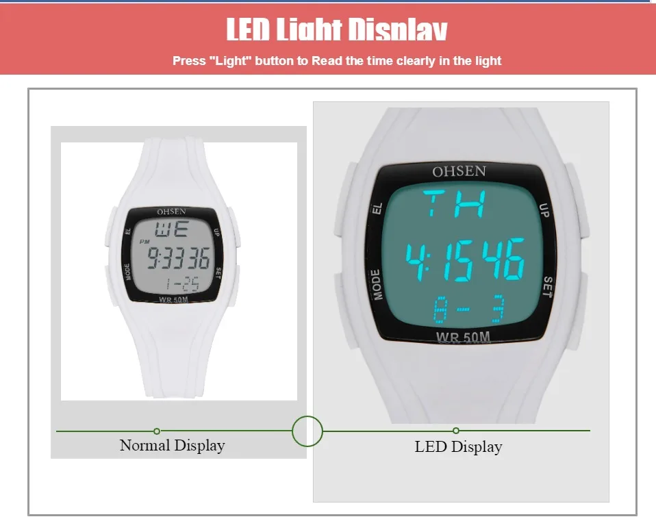 1. Цифровой дисплей: час, минута, секунда, pm, месяц, дата, день2. Будильник формата 12/24 часов и функция ежечасного звонка3. Специальная конструкция с хронограф (секундомер) при температуре не выше 0,01 второй шаг4. Глубина водонепроницаемости до 50 м (не нажимайте кнопку в воде)5. Дополнительный ЖК-светильник для отображения времени в темноте