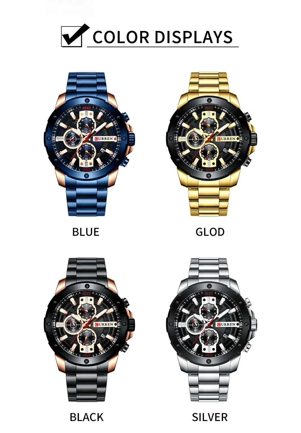 CURREN Роскошные Брендовые спортивные часы из нержавеющей стали, мужские новые наручные часы с хронографом, модные повседневные кварцевые часы с датой, мужские часы