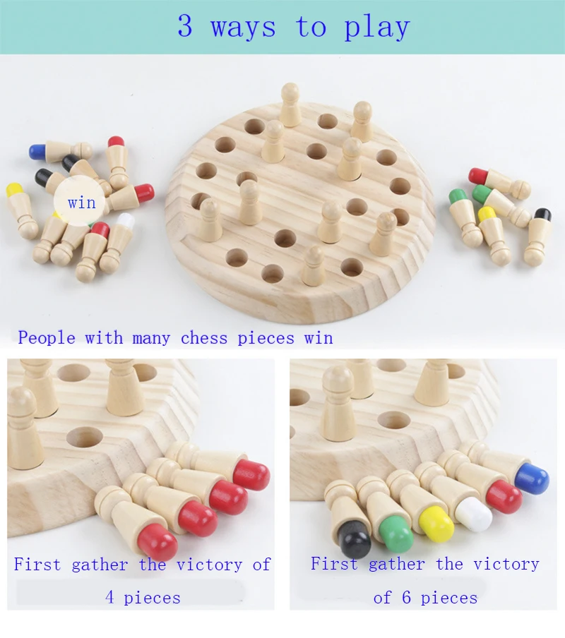 Название продукта: шахматная игра с памятью Возрастной диапазон:> 3 года Размер: диаметр 18 см, один размер: 1,5*4,3 см Материал: дерево Упаковка: пакет OPP Содержимое: 1 шахматная доска, 1 кубик, 24 шахматных фигуры (6 цветов, 4 каждого цвета) Не оставляйте мелкую деталь малышу до 3 лет Пожалуйста, используйте под присмотром взрослых