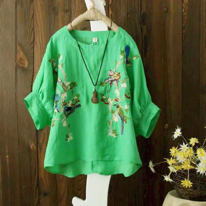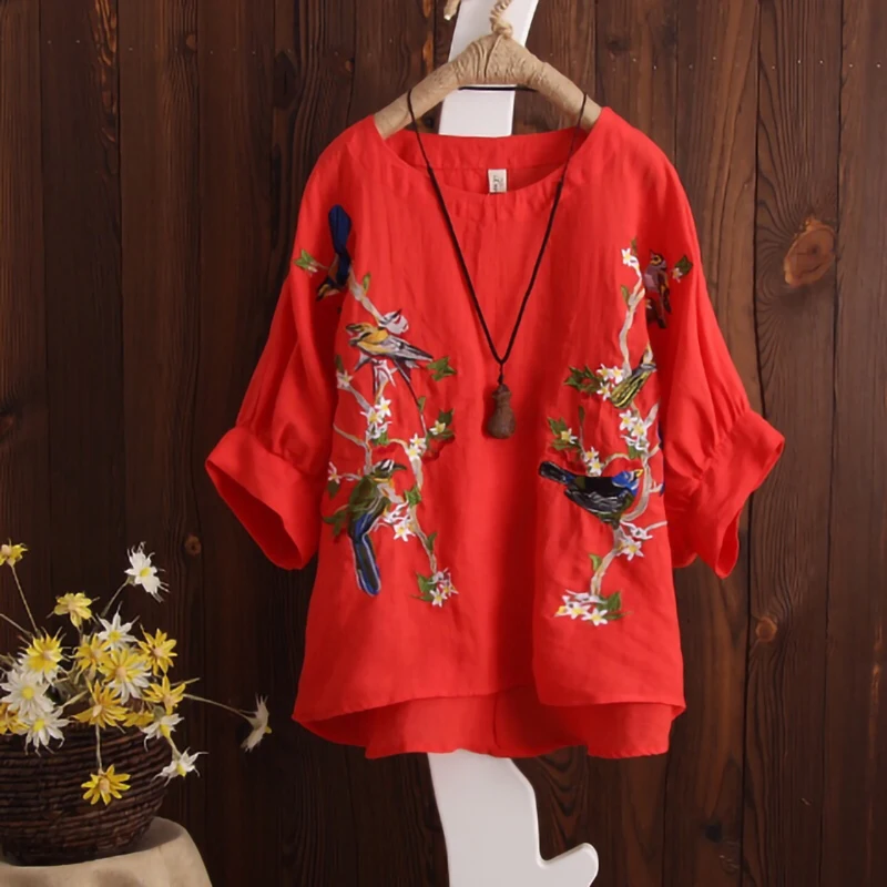 Блузка размера плюс, женские топы, свободная блузка с вышивкой, винтажная хлопковая Повседневная рубашка с рукавом летучая мышь