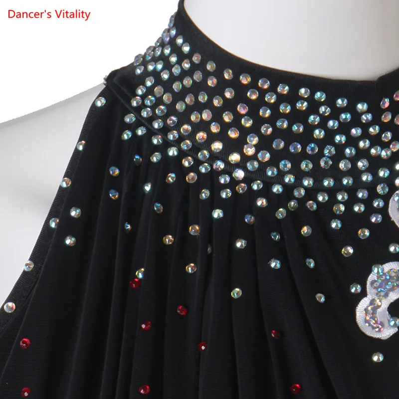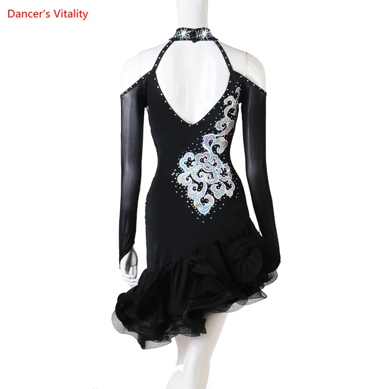 Женское платье для латинских танцев, черное танцевальное платье с длинным рукавом для девушек, костюмы для латинских танцев со стразами, платья для девушек для соревнований