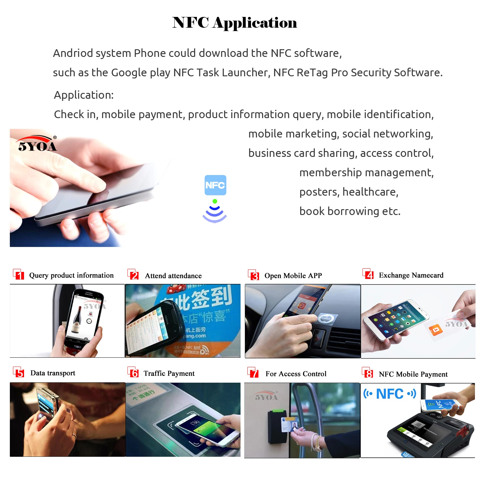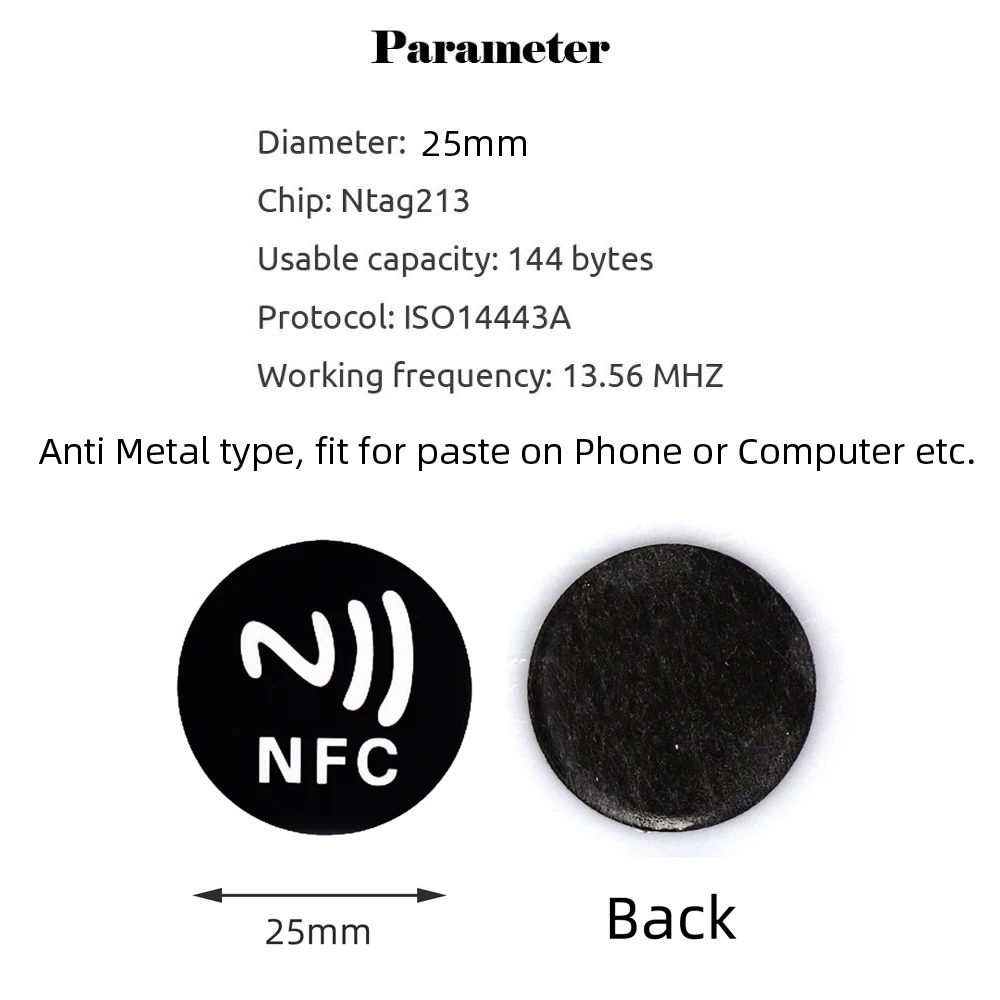 Антиметаллический тип, подходит для наклеивания на металлический материал, например, телефон, компьютер или другие. Совместимость: Поддержка считывателя/записи 13,56 МГц RFID и NFC IC, например: считыватель/Писатель Acr122u поддерживает смартфоны с функцией NFC. Системный телефон Andriod может загрузить NFC программное обеспечение, например, Google play NFC Task запуск, NFC ReTag Pro программное обеспечение безопасности. Применение: регистрация, мобильные платежи, запрос информации о продукте, идентификация мобильных устройств, мобильный маркетинг, социальные сети, Обмен визитными картами, контроль доступа, управление членством, плакаты, здравоохранение, заимствование книг и т. д. Параметры: чип: Ntag213 Диаметр: 25 мм полезная емкость: 144 байта протокол: ISO14443A частота: 13,56 МГц упаковочные материалы: ПЭ самоклеящаяся + мелованная бумага время стирания: > 100000 раз Хранение данных: > 10 лет