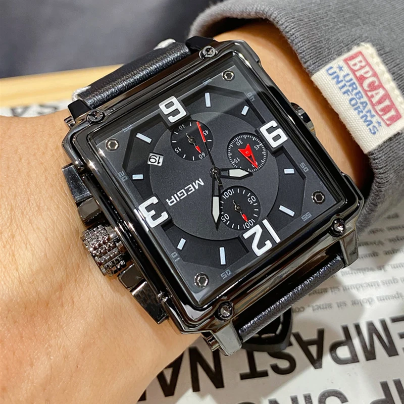 Особенности: -Оригинальные часы MEGIR Из заводского магазина наручных часов; -100% новый с биркой и качественным квартаном; -Водонепроницаемость 3 АТМ (вы можете использовать его во время дождя и мытья рук, не поддерживает горячую воду и плавание); -С хронографом (секундомером) и функцией подсветки, с датой; -MEGIR Креативный дизайн и высококачественные материалы. Характеристики: -Товар: Мужские квадратные кварцевые часы -Модель: MEGIR 2061M -Тип часов: кварцевые часы/мужские часы/военные часы -Функция: хронограф, секундомер, светящийся, календарь (дата), водонепроницаемый -Материал корпуса: сплав -Материал ремешка: кожа Параметры: -Чехол Диаметр: около 41*55 мм -Чехол Толщина: около 14 мм -Длина ремешка (максимальная носимая длина): около 225 мм -Ширина ремешка: около 24 мм Посылка включает в себя: -Часы Megir-1 шт. -1 Руководство пользователя с гарантийным талоном -1 x салфетка для чистки часов