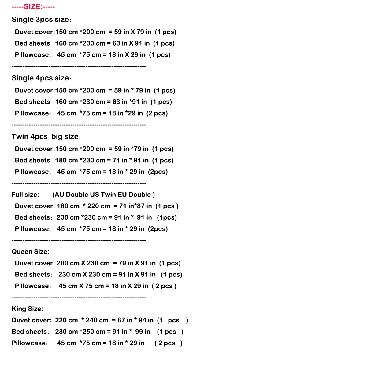 ----- Размер: -----Размер одного 3 шт.:Пододеяльник: 150 см * 200 см = 59 дюймов X 79 дюймов (1 шт.)Простыни 160 см * 230 см = 63 дюйма X 91 дюйма (1 шт.)Наволочка: 45 см * 75 см = 18 дюймов X 29 дюймов (1 шт.)--------------------------------------------------------------Размер одного 4 шт.:Пододеяльник: 150 см * 200 см = 59 дюймов * 79 дюймов (1 шт.)Простыни 160 см * 230 см = 63 дюйма * 91 дюймов (1 шт.)Наволочка: 45 см * 75 см = 18 дюймов * 29 дюймов (2 шт.)--------------------------------------------------------------Twin 4 шт Большой размер:Пододеяльник: 150 см * 200 см = 59 дюймов * 79 дюймов (1 шт.)Простыни 180 см * 230 см = 71 дюйм * 91 дюйм (1 шт.)Наволочка: 45 см * 75 см = 18 дюймов * 29 дюймов (2 шт.)--------------------------------------------------------------Полный размер: (AU Double US Twin EU Double)Пододеяльник: 180 см * 220 см = 71 дюйм * 87 дюйм (1 шт.)Простыни: 230 см * 230 см = 91 дюйм * 91 дюйм (1 шт.)Наволочка: 45 см * 75 см = 18 дюймов * 29 дюймов (2 шт.)--------------------------------------------------------------Размер королевы:Пододеяльник: 200 см X 230 см = 79 дюймов X 91 дюймов (1 шт.)Простыни: 230 см X 230 см = 91 дюйм X 91 дюйм (1 шт.)Наволочка: 45 см X 75 см = 18 дюймов X 29 дюймов (2 шт.)--------------------------------------------------------------Размер King:Пододеяльник: 220 см * 240 см = 87 дюймов * 94 дюймов (1 шт.)Простыни: 230 см * 250 см = 91 дюйм * 99 дюйм (1 шт.)Наволочка: 45 см * 75 см = 18 дюймов * 29 дюймов (2 шт.)