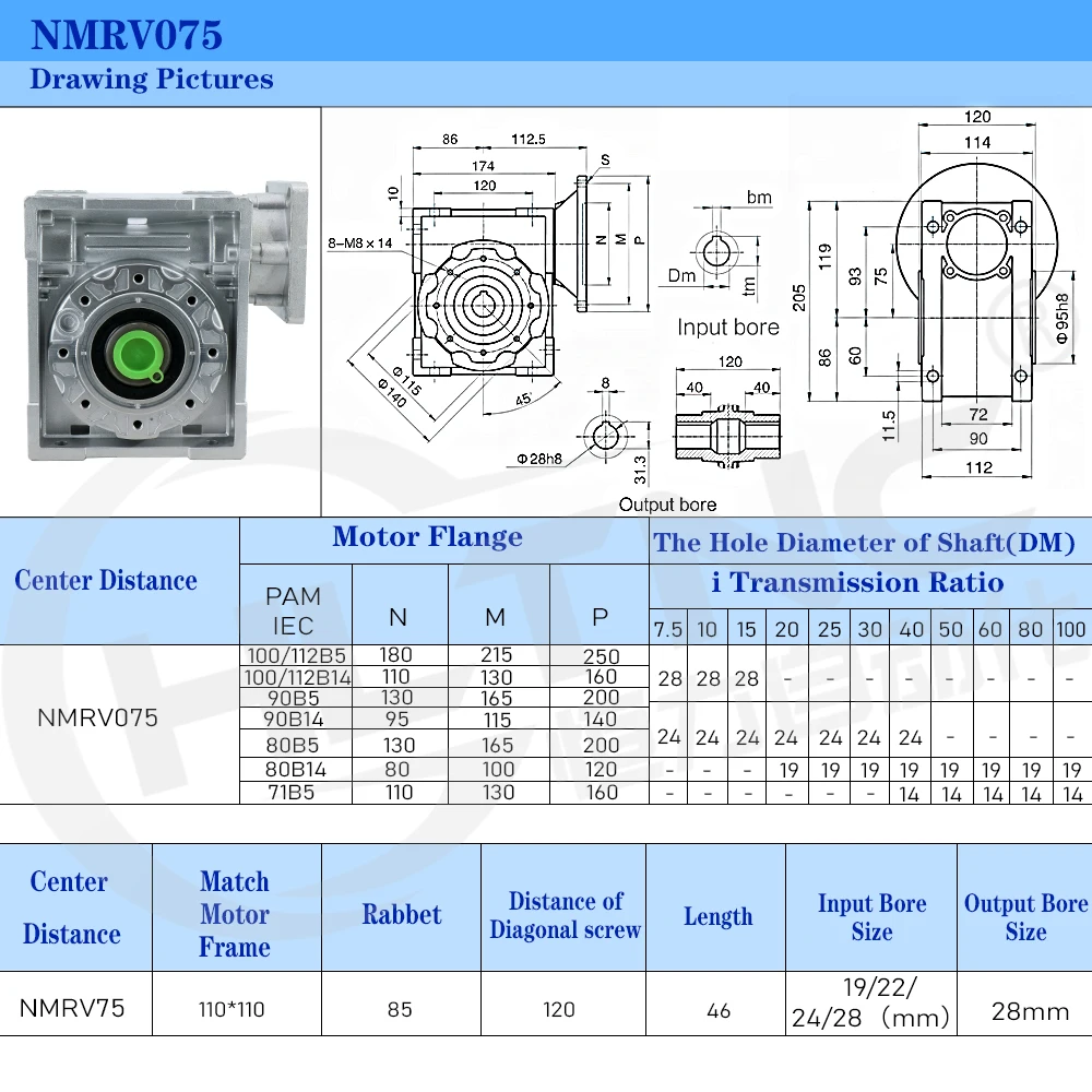 Червячный редуктор NMRV075 1:100, Передаточное отношение 19 мм, 24 мм, 28 мм, входной вал 28 мм, выходной вал, червячный редуктор 90 градусов