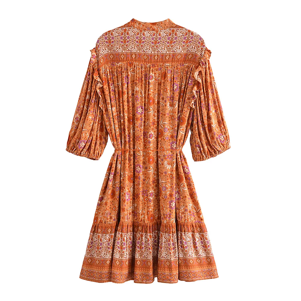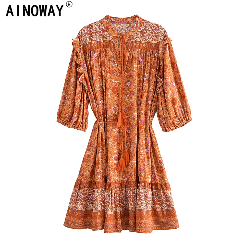 Винтажное шикарное женское оранжевое платье с цветочным принтом и рукавами-фонариками, Пляжное богемное мини-платье с бахромой, женское свободное платье бохо из вискозы с V-образным вырезом