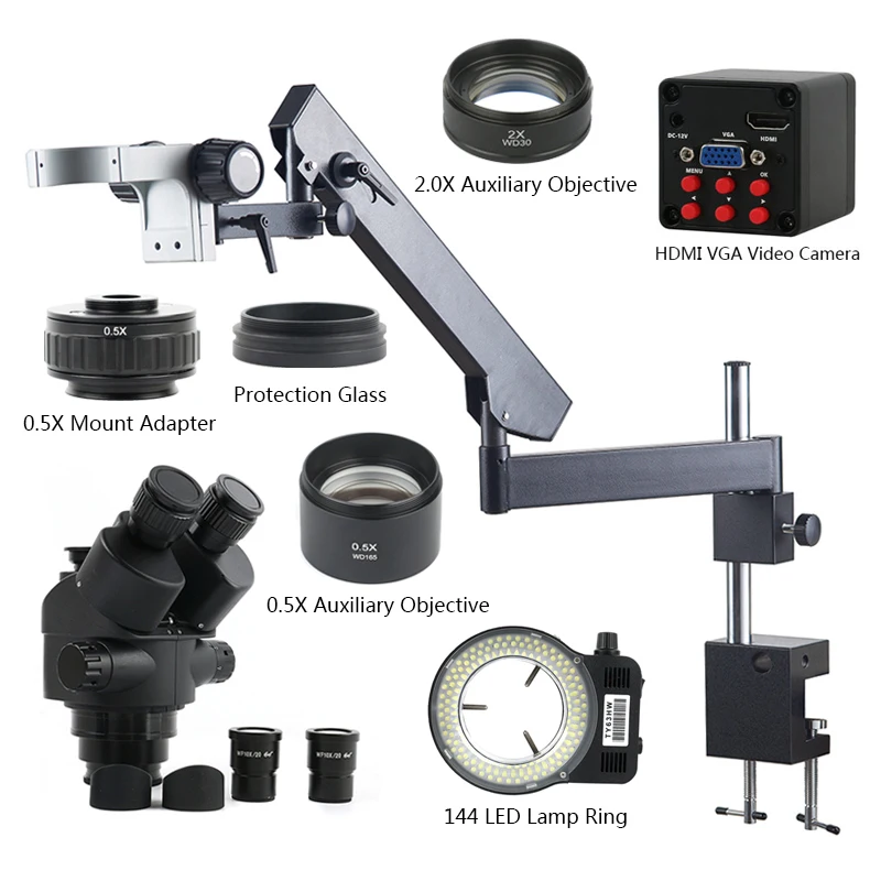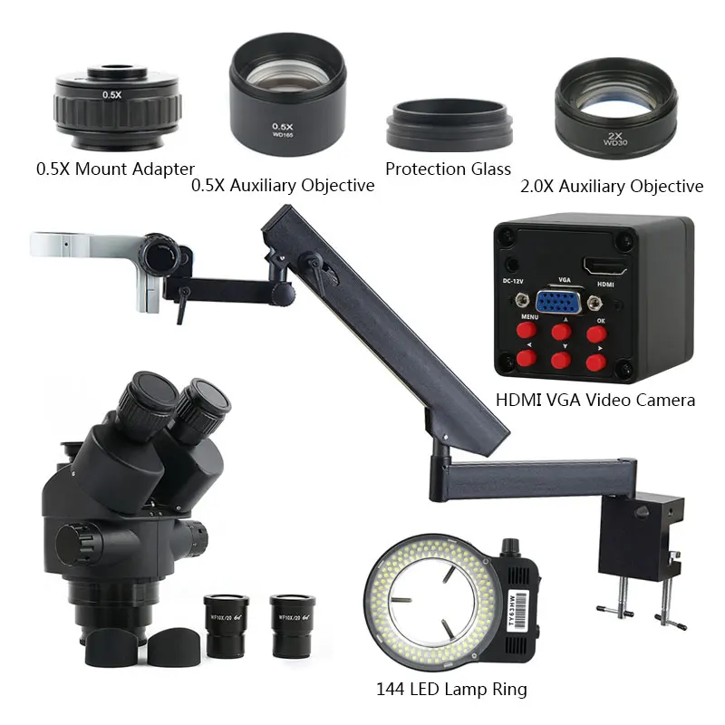 Мультифокальный Тринокулярный стереомикроскоп с увеличением 1080-90 раз + промышленная видеокамера P HDMI VGA + шарнирная рукоятка, стопорный зажим