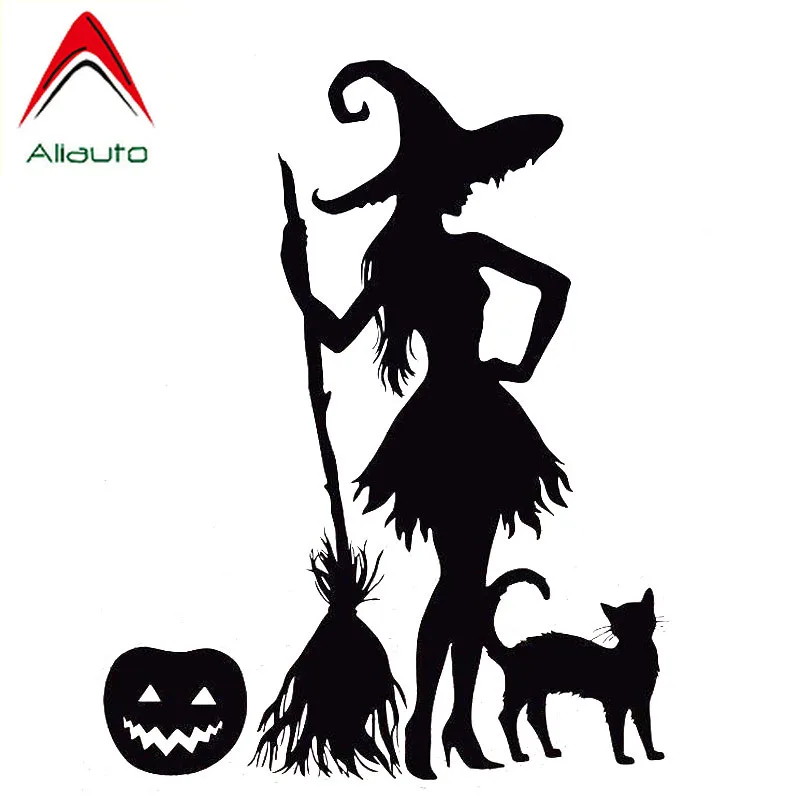 Забавная Автомобильная наклейка Aliauto с тыквой, ведьмой, метлой, кошкой, волшебным монстром, виниловые аксессуары, черная/Серебристая Наклейка из ПВХ для Toyota,20 см * 15 см