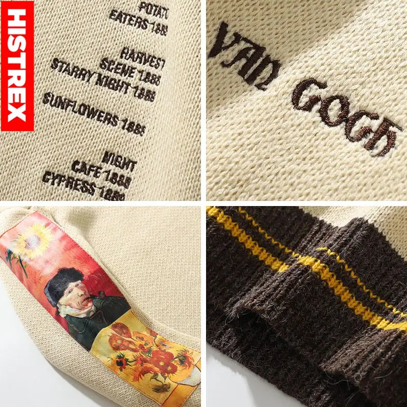 Свитер мужской шерстяной, 100% хлопок, в стиле хип-хоп, с вышивкой Ван Гога