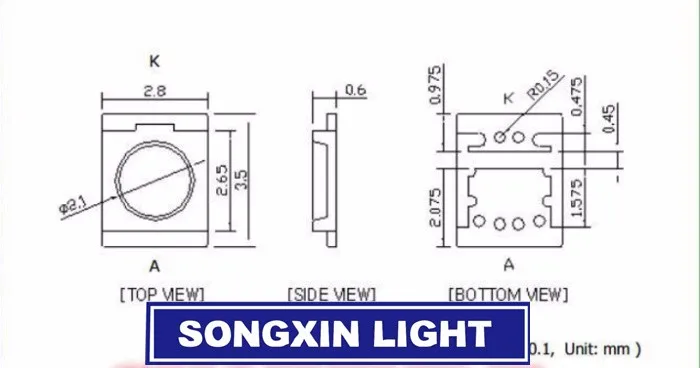 Тип светодиодной лампы:3,5 × 2,8 × 0,6 мм (L×W×H), d = 2,1 мм